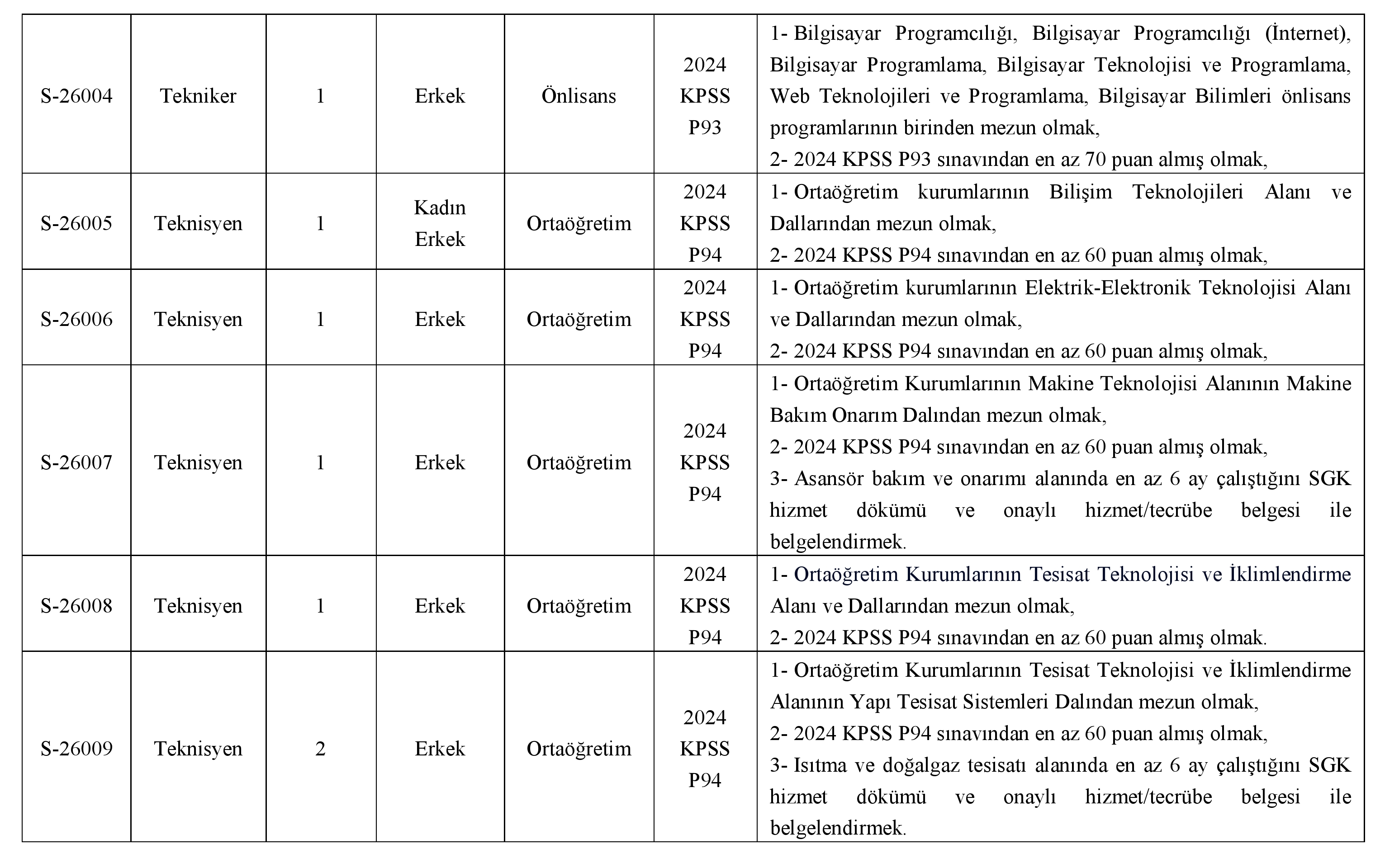 13- Adayların 2024 KPSS (B) grubu puan türlerinden lisans mezunları için KPSSP3, ön lisans mezunları için KPSSP93 ve ortaöğretim mezunları için KPSSP94 puan türüne sahip olması gerekmektedir.