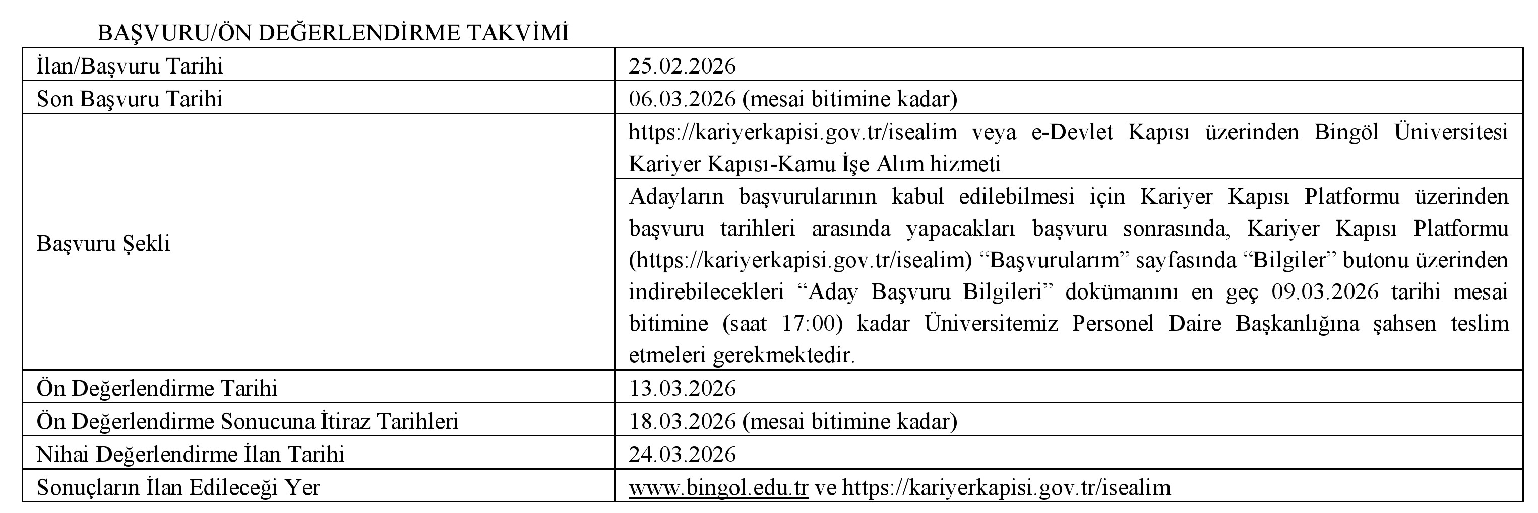 Yerleştirme sonuçlarına göre sözleşme yapmaya hak kazanan adaylar sonuçları Üniversitemiz internet sitesi (www.bingol.edu.tr) ile Kariyer Kapısı Kamu İşe Alım Platformu (https://kariyerkapisi.gov.tr/) üzerinden görüntüleyebilecektir. Kazanan adayların işe başlamaları için gerekli belgeler Üniversitemiz internet sitesi www.bingol.edu.tr adresinde yayımlanacaktır. Asıl kazananlardan süresi içerisinde başvuran olmadığı takdirde veya aranan şartları taşımadığı tespit edilenlerin yerine yedek adaylardan sırasıyla yerleştirme yapılacaktır. Bu ilan tebliğ mahiyetinde olacağından ayrıca tebligat yapılmayacaktır.