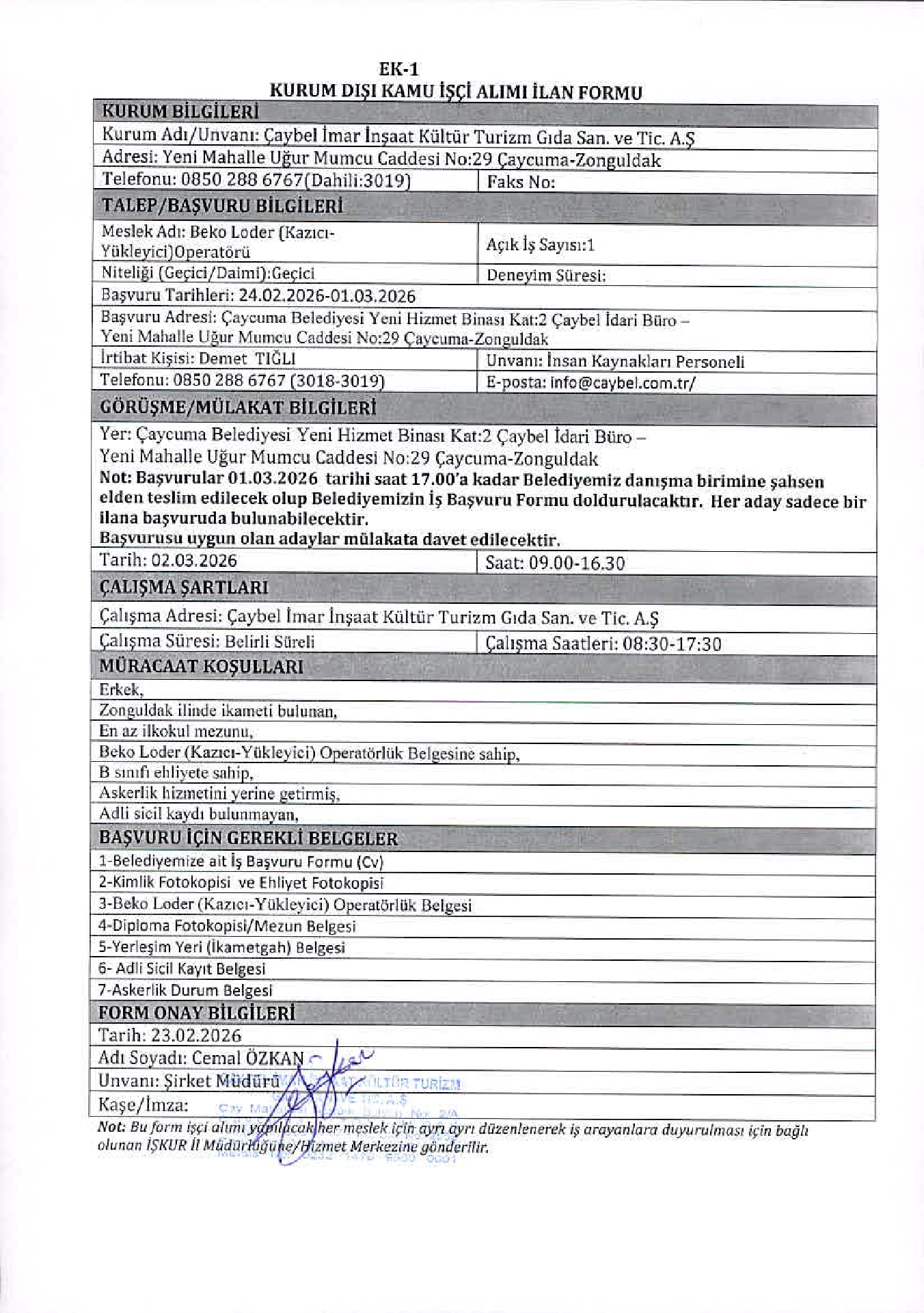 Ana sayfaGeçici İşçi İlanları Zonguldak Çaybel İmar Geçici 1 İşçi Alacak Zonguldak Çaybel İmar Geçici 1 İşçi Alacak. Son başvuru tarihi 1 Mart 2026 Kaynak : İşkur İlan Giriş : 25 Şubat 2026 23:16, Son Güncelleme : 25 Şubat 2026 23:43 Yazdır Yorumlar (0) Abone Ol