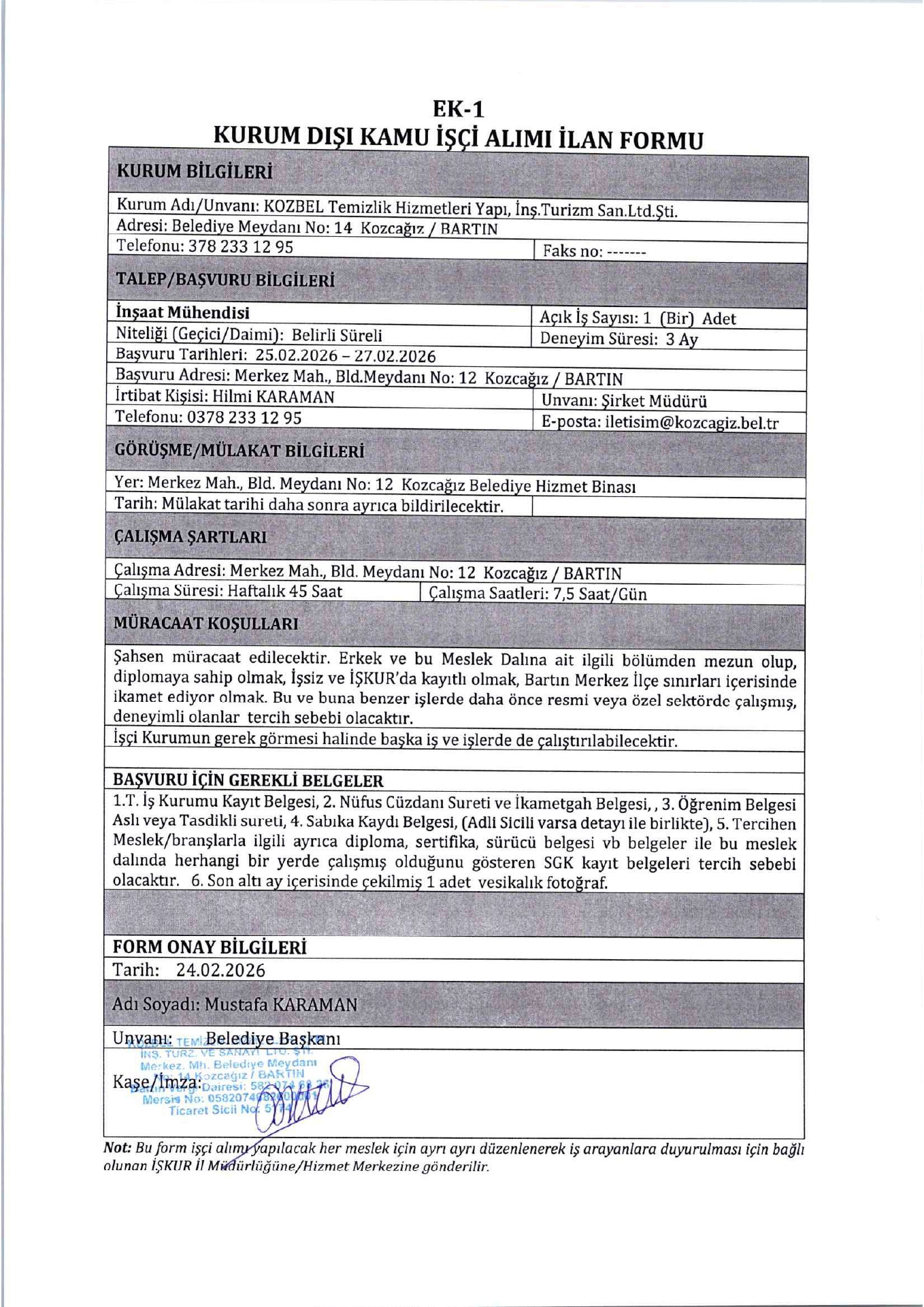 Ana sayfaGeçici İşçi İlanları Bartın Kozbel Temizlik Geçici 1 İşçi Alacak Bartın Kozbel Temizlik Geçici 1 İşçi Alacak. Son başvuru tarihi 27 Şubat 2026 Kaynak : İşkur İlan Giriş : 25 Şubat 2026 23:32, Son Güncelleme : 25 Şubat 2026 23:39 Yazdır Yorumlar (0) Abone Ol