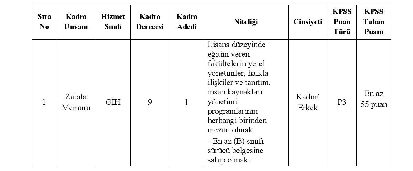 Sivas ili Akıncılar Belediye Başkanlığı bünyesinde, 657 sayılı Devlet Memurları Kanununa tabi olarak istihdam edilmek üzere; Belediye Zabıta Yönetmeliği hükümlerine göre aşağıda unvanı, sınıfı, derecesi, adedi, nitelikleri, KPSS puan türü, KPSS taban puanı ve diğer şartları taşımak kaydıyla belirtilen boş kadrolara açıktan atama yoluyla zabıta memuru alımı yapılacaktır.