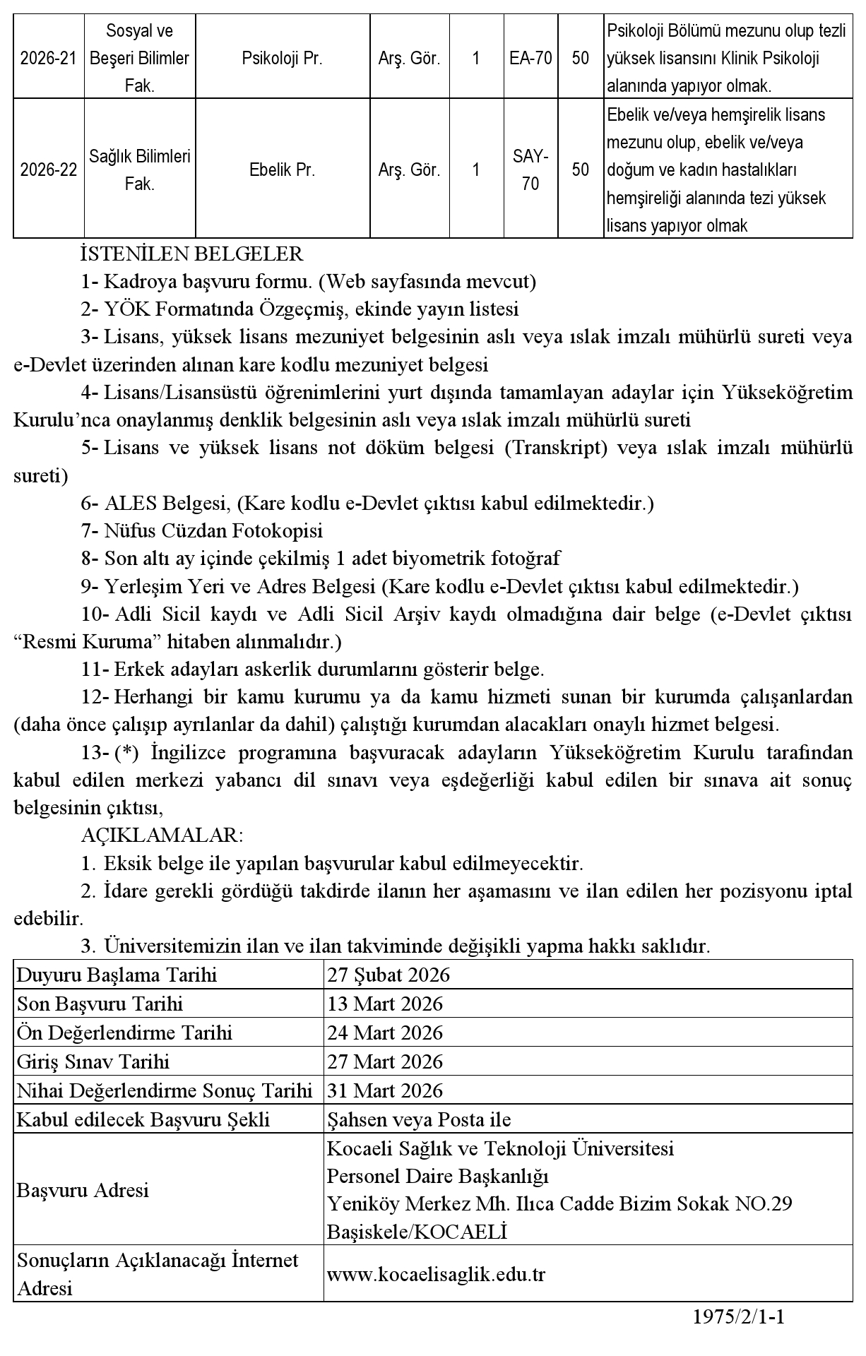 Kocaeli Sağlık ve Teknoloji Üniversitesi Öğretim Üyesi ve Elemanı Alım İlanı. Son başvuru tarihi 13 Mart 2026