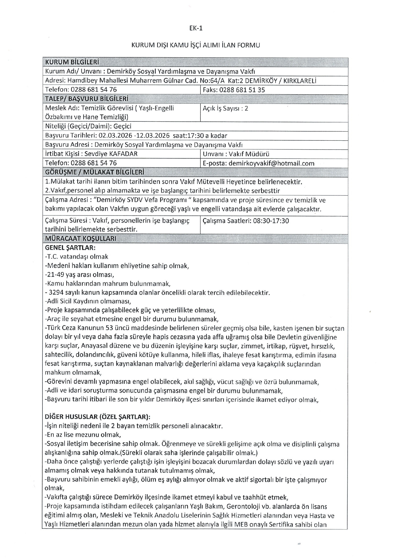 Ana sayfaSYDV İlanlarıAna sayfaGeçici İşçi İlanları Kırklareli Demirköy SYDV Geçici 2 İşçi Alacak Kırklareli Demirköy SYDV Geçici 2 İşçi Alacak. Son başvuru tarihi 12 Mart 2026 Kaynak : İşkur İlan Giriş : 27 Şubat 2026 23:32, Son Güncelleme : 27 Şubat 2026 23:37 Yazdır Yorumlar (0) Abone Ol
