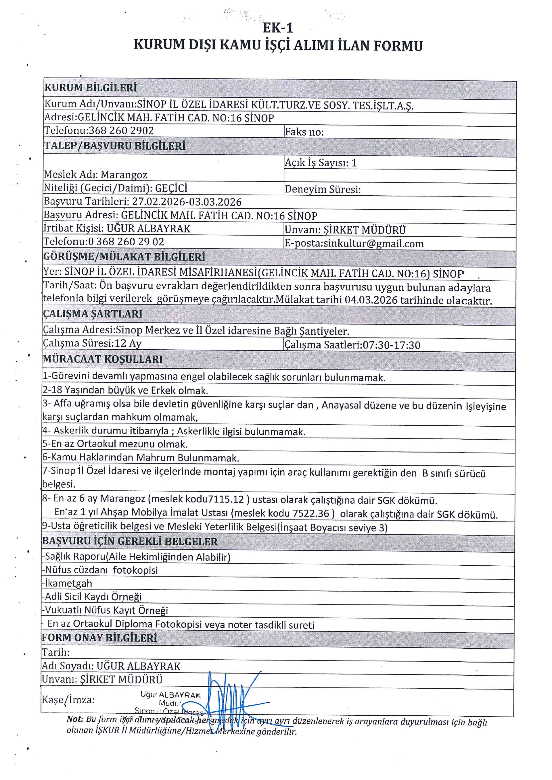 Ana sayfaGeçici İşçi İlanları Sinop İl Özel İdaresi 1 İşçi Alacak Sinop İl Özel İdaresi 1 İşçi Alacak. Son başvuru tarihi 3 Mart 2026 Kaynak : İşkur İlan Giriş : 27 Şubat 2026 23:48, Son Güncelleme : 27 Şubat 2026 23:34 Yazdır Yorumlar (0) Abone Ol