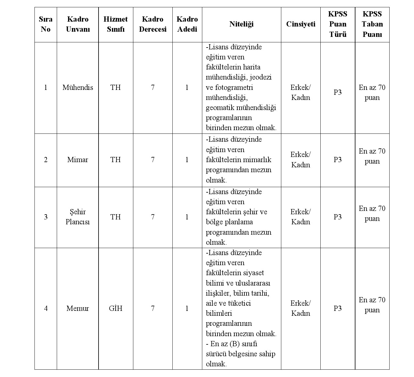 Yalova ili Çınarcık Belediye Başkanlığı bünyesinde, 657 sayılı Devlet Memurları Kanununa tabi olarak istihdam edilmek üzere; Mahalli İdarelere İlk Defa Atanacaklara Dair Sınav ve Atama Yönetmeliği hükümlerine göre aşağıda unvanı, sınıfı, derecesi, adedi, nitelikleri, KPSS puan türü, KPSS taban puanı ve diğer şartları taşımak kaydıyla belirtilen boş kadrolara açıktan atama yoluyla memur alınacaktır.