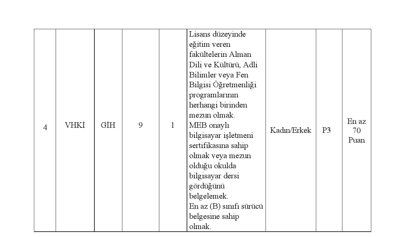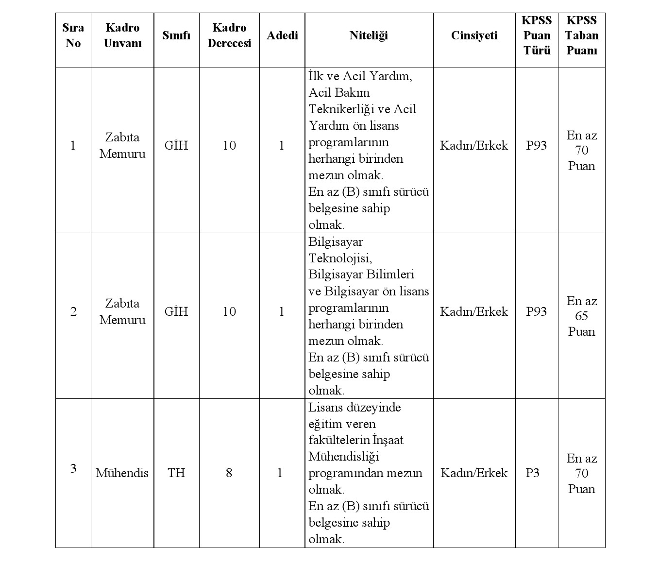 Erzurum ili Hınıs Belediye Başkanlığı bünyesinde 657 sayılı Devlet Memurları Kanununa tabi olarak istihdam edilmek üzere; Mahalli İdarelere İlk Defa Atanacaklara Dair Sınav ve Atama Yönetmeliği ile Belediye Zabıta Yönetmeliği hükümlerine göre aşağıda unvanı, sınıfı, derecesi, adedi, nitelikleri, KPSS puan türü, KPSS taban puanı ve diğer şartları taşımak kaydıyla, belirtilen boş kadrolara açıktan atama yoluyla memur ve zabıta memuru alınacaktır.