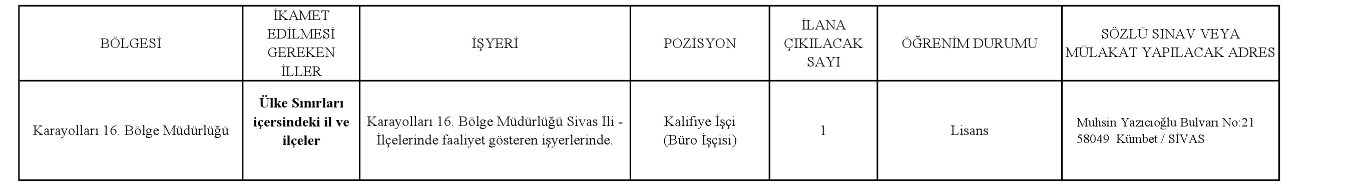 SÜRESİ BELİRLİ OLMAYAN SÜREKLİ İŞ SÖZLEŞMESİ İLE ÇALIŞTIRILMAK ÜZERE; TOPLAM 1 (BİR) ESKİ HÜKÜMLÜ VEYA TERÖRLE MÜCADELEDE MALÜL SAYILMAYACAK ŞEKİLDE YARALANAN (TMY) İŞÇİ ALINACAKTIR.