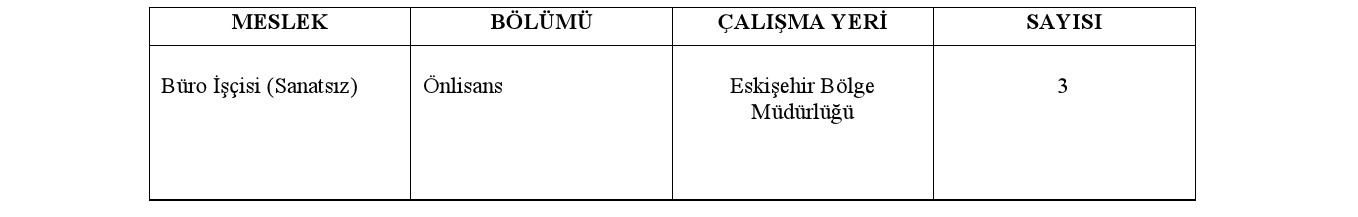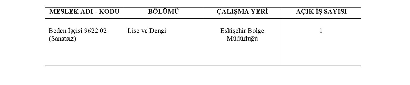 Genel Müdürlüğümüze bağlı Eskişehir Bölge Müdürlüğümüzde istihdam edilmek üzere, Kamu Kurum ve Kuruluşlarına Eski Hükümlü veya Terörle Mücadelede Malul Sayılmayacak Şekilde Yaralananların İşçi Olarak Alınmasında Uygulanacak Usul ve Esaslar Hakkında Yönetmelik kapsamında Türkiye İş Kurumu (İŞKUR) üzerinden 4857 sayılı İş Kanununa tabi belirsiz süreli iş sözleşmesi ile çalıştırılmak üzere daimi Eski Hükümlü işçi alımı yapılacaktır.