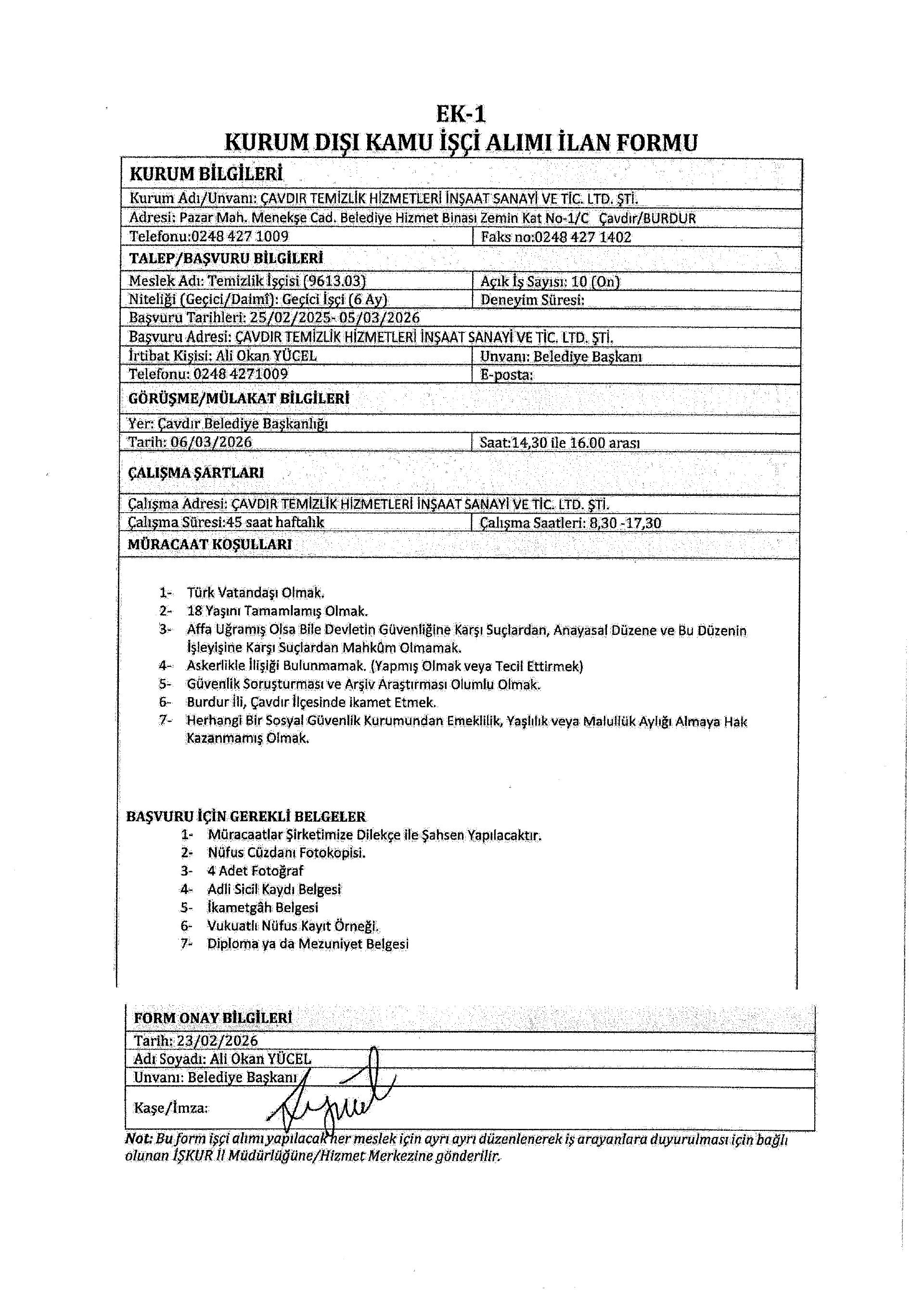Burdur Çavdır Temizlik Geçici 10 İşçi Alacak. Son başvuru tarihi 5 Mart 2026