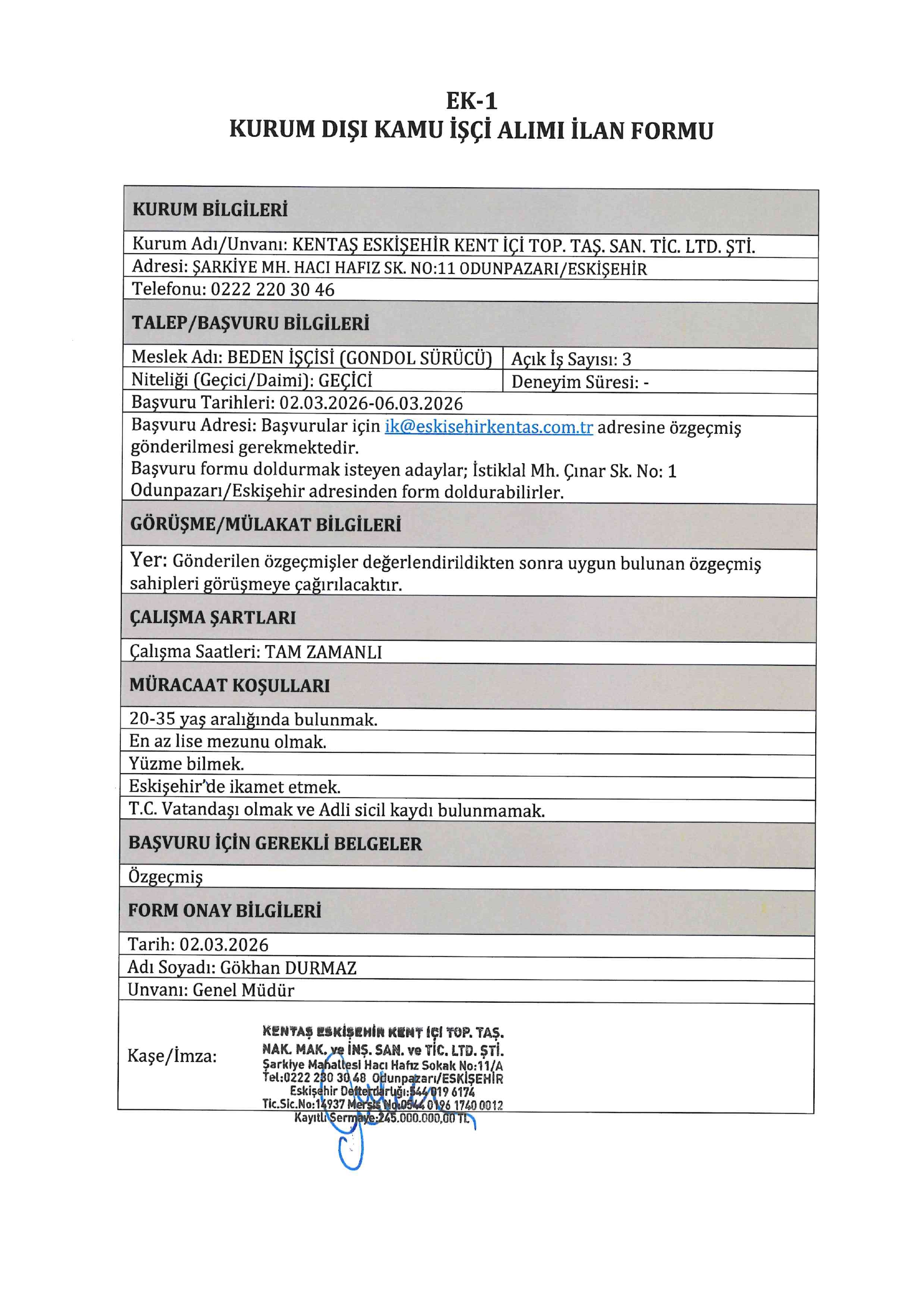 Eskişehir Kentaş Geçici 3 İşçi Alacak. Son başvuru tarihi 6 Mart 2026