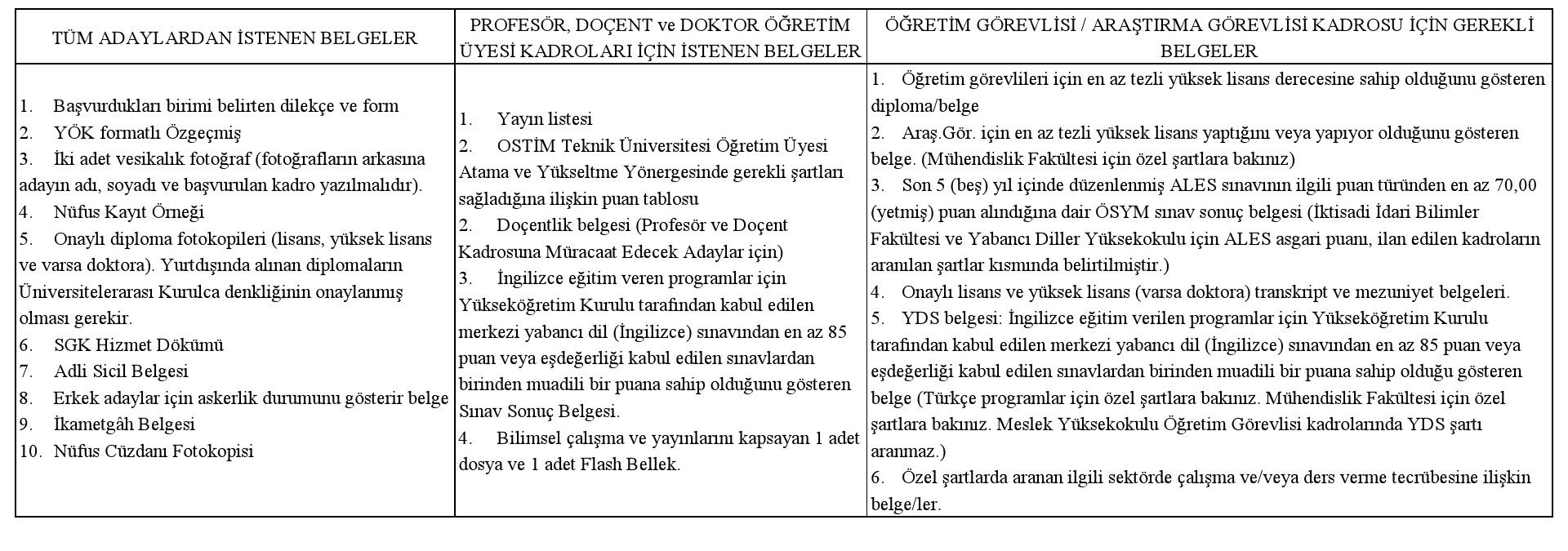 Müracaat edecek adayların ilgili Yönetmelik ve Yönerge hükümlerinde belirtilen asgari başvuru koşullarını sağlamaları ve aşağıda istenilen belgeler ile birlikte Profesör ve Doçent kadrosuna müracaat edecek adayların OSTİM Teknik Üniversitesi İnsan Kaynakları Daire Başkanlığına, Doktor Öğretim Üyesi, Öğretim Görevlisi ve Araştırma Görevlisi kadrolarına müracaat edecek adayların ise ilgili Fakülte Dekanlıklarına veya Yüksekokul Müdürlüğüne şahsen veya posta yoluyla başvurmaları gerekmektedir.