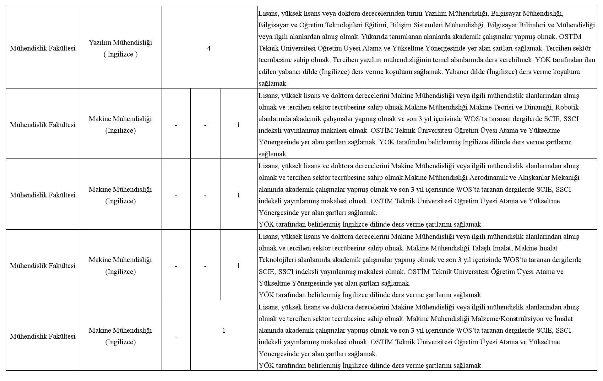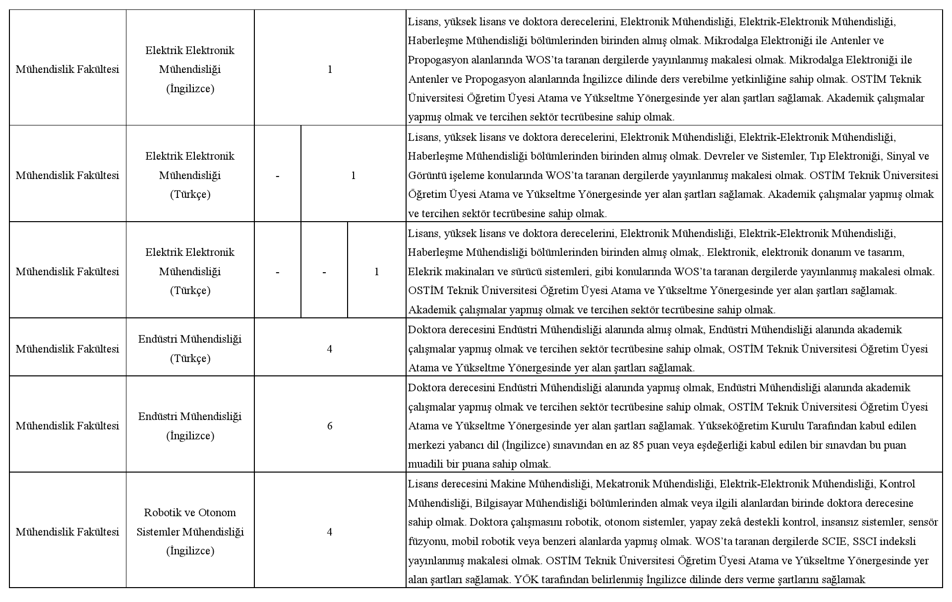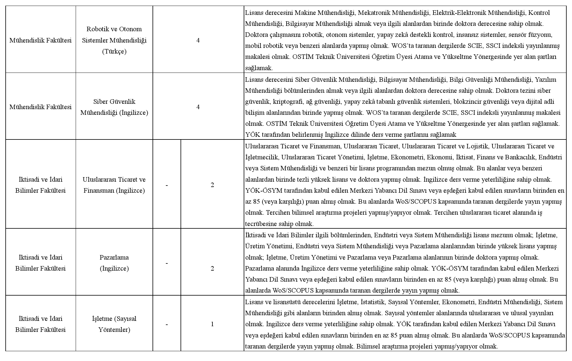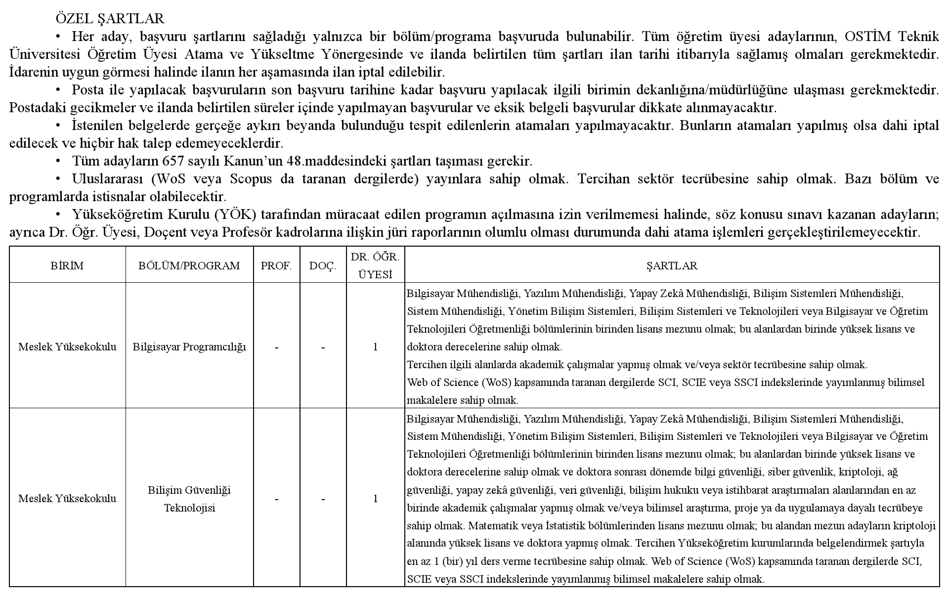Üniversitemize 2547 sayılı Yükseköğretim Kanunu ve ilgili kanunlar, Öğretim Üyeliğine Yükseltilme ve Atanma Yönetmeliği, Öğretim Üyesi Dışındaki Öğretim Elemanı Kadrolarına Yapılacak Atamalarda Uygulanacak Merkezi Sınav ile Giriş Sınavlarına İlişkin Usul ve Esaslar Hakkında Yönetmelik, Vakıf Yükseköğretim Kurumları Yönetmeliği ile OSTİM Teknik Üniversitesi Öğretim Üyesi Atama ve Yükseltme Yönergesinin ilgili maddeleri uyarınca aşağıda nitelikleri belirtilen kadrolara tam zamanlı öğretim elemanı alınacaktır.