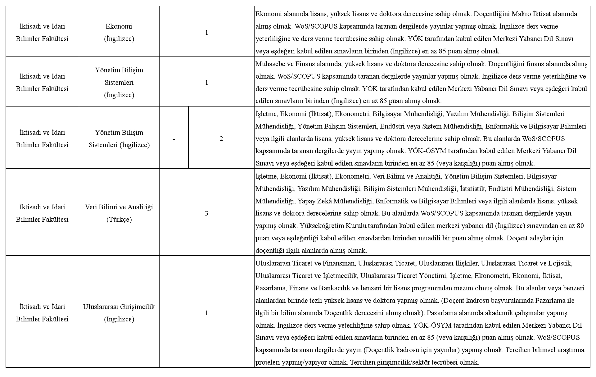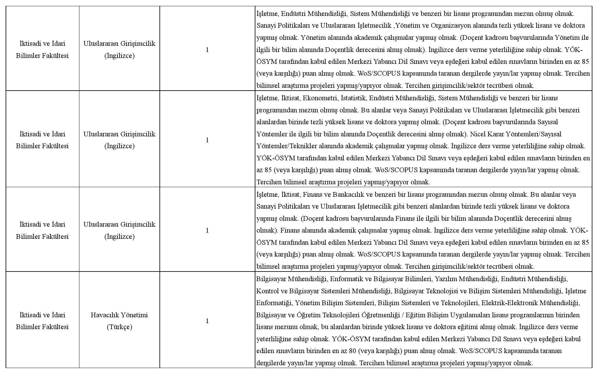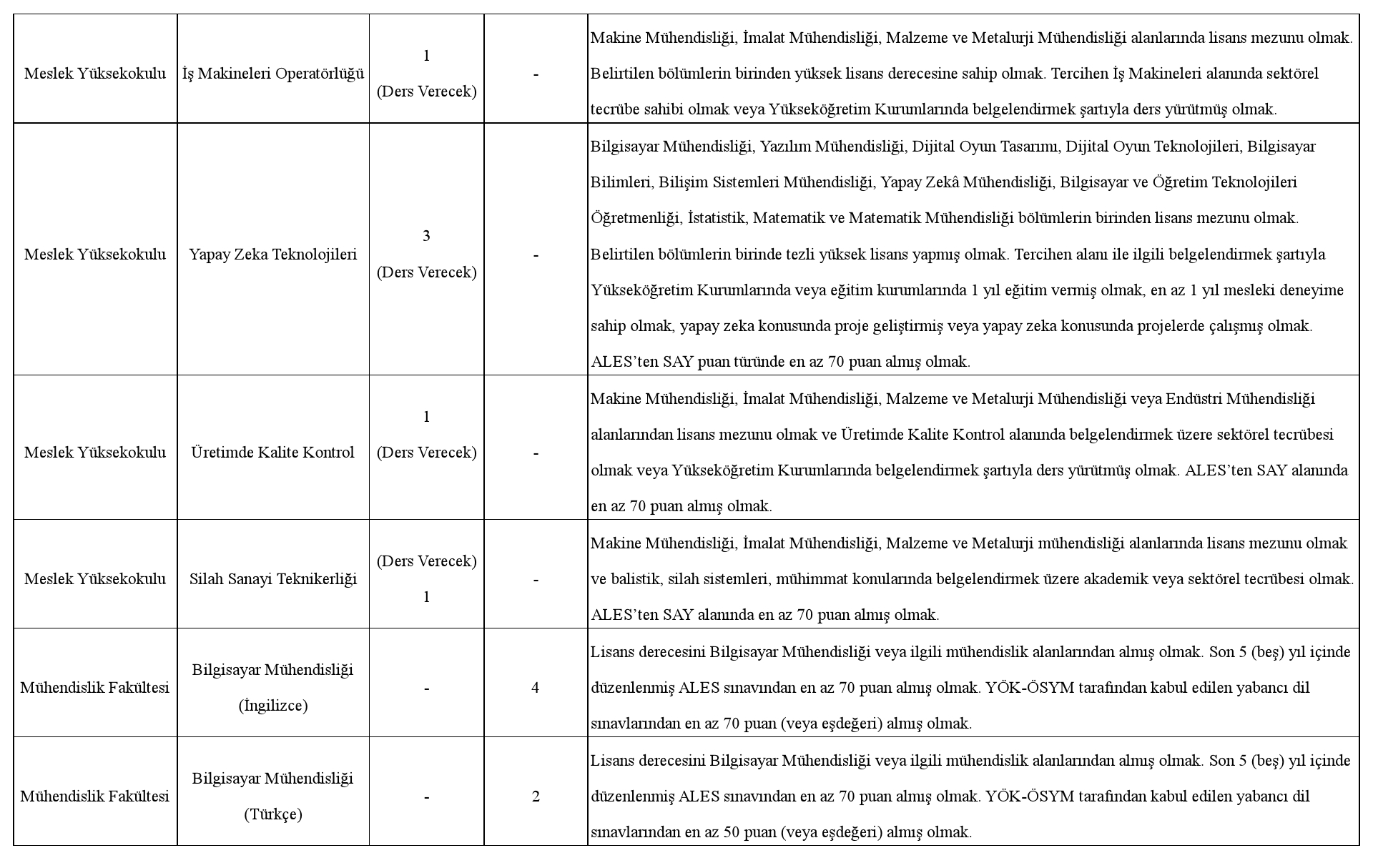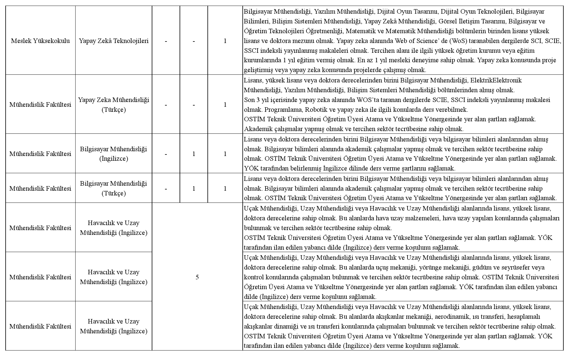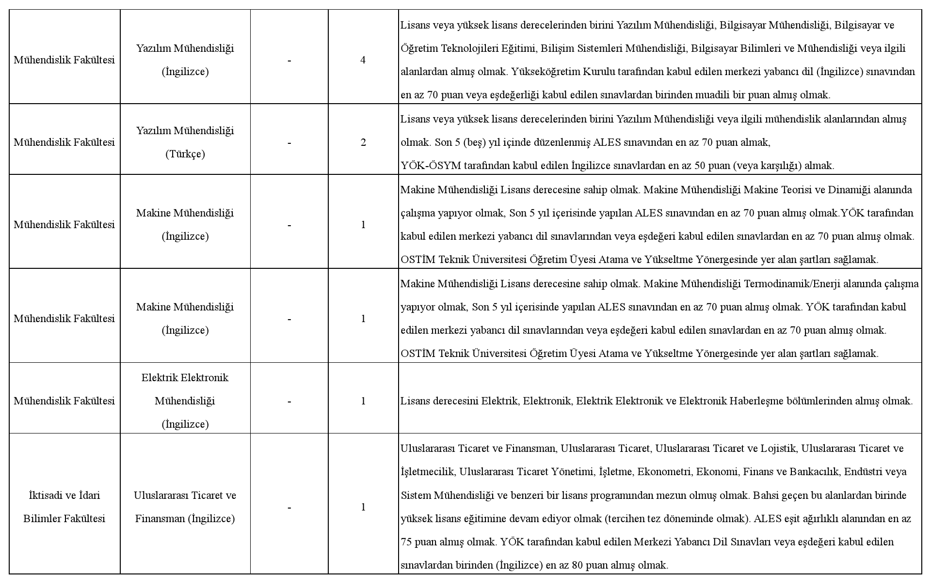 Üniversitemize 2547 sayılı Yükseköğretim Kanunu ve ilgili kanunlar, Öğretim Üyeliğine Yükseltilme ve Atanma Yönetmeliği, Öğretim Üyesi Dışındaki Öğretim Elemanı Kadrolarına Yapılacak Atamalarda Uygulanacak Merkezi Sınav ile Giriş Sınavlarına İlişkin Usul ve Esaslar Hakkında Yönetmelik, Vakıf Yükseköğretim Kurumları Yönetmeliği ile OSTİM Teknik Üniversitesi Öğretim Üyesi Atama ve Yükseltme Yönergesinin ilgili maddeleri uyarınca aşağıda nitelikleri belirtilen kadrolara tam zamanlı öğretim elemanı alınacaktır.