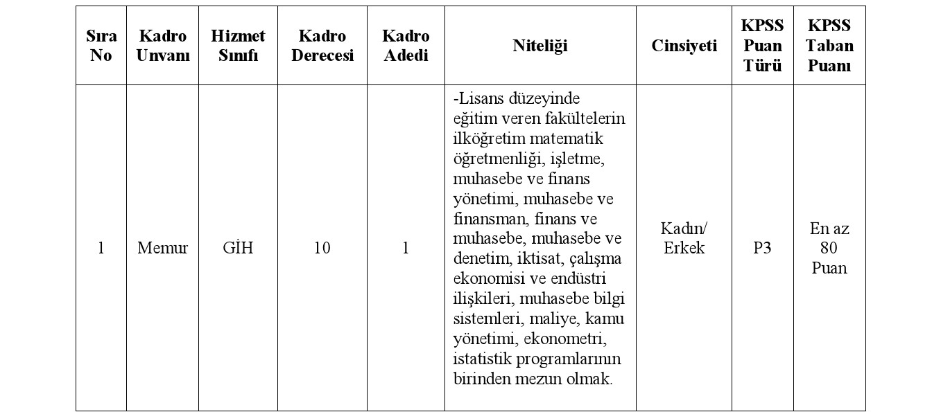 Kilis İli Elbeyli Belediye Başkanlığı bünyesinde, 657 sayılı Devlet Memurları Kanununa tabi olarak istihdam edilmek üzere; Mahalli İdarelere İlk Defa Atanacaklara Dair Sınav ve Atama Yönetmeliği hükümlerine göre aşağıda unvanı, sınıfı, derecesi, adedi, nitelikleri, KPSS puan türü, KPSS taban puanı ve diğer şartları taşımak kaydıyla belirtilen boş kadroya açıktan atama yoluyla memur alınacaktır.