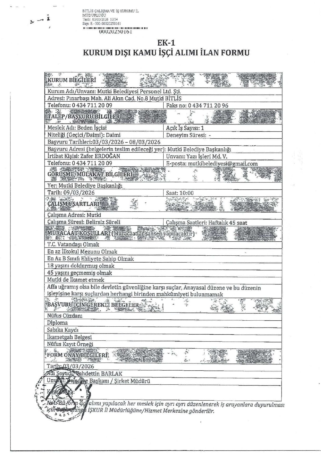 Bitlis Mutki Belediyesi 1 İşçi Alacak. Son başvuru tarihi 8 Mart 2026