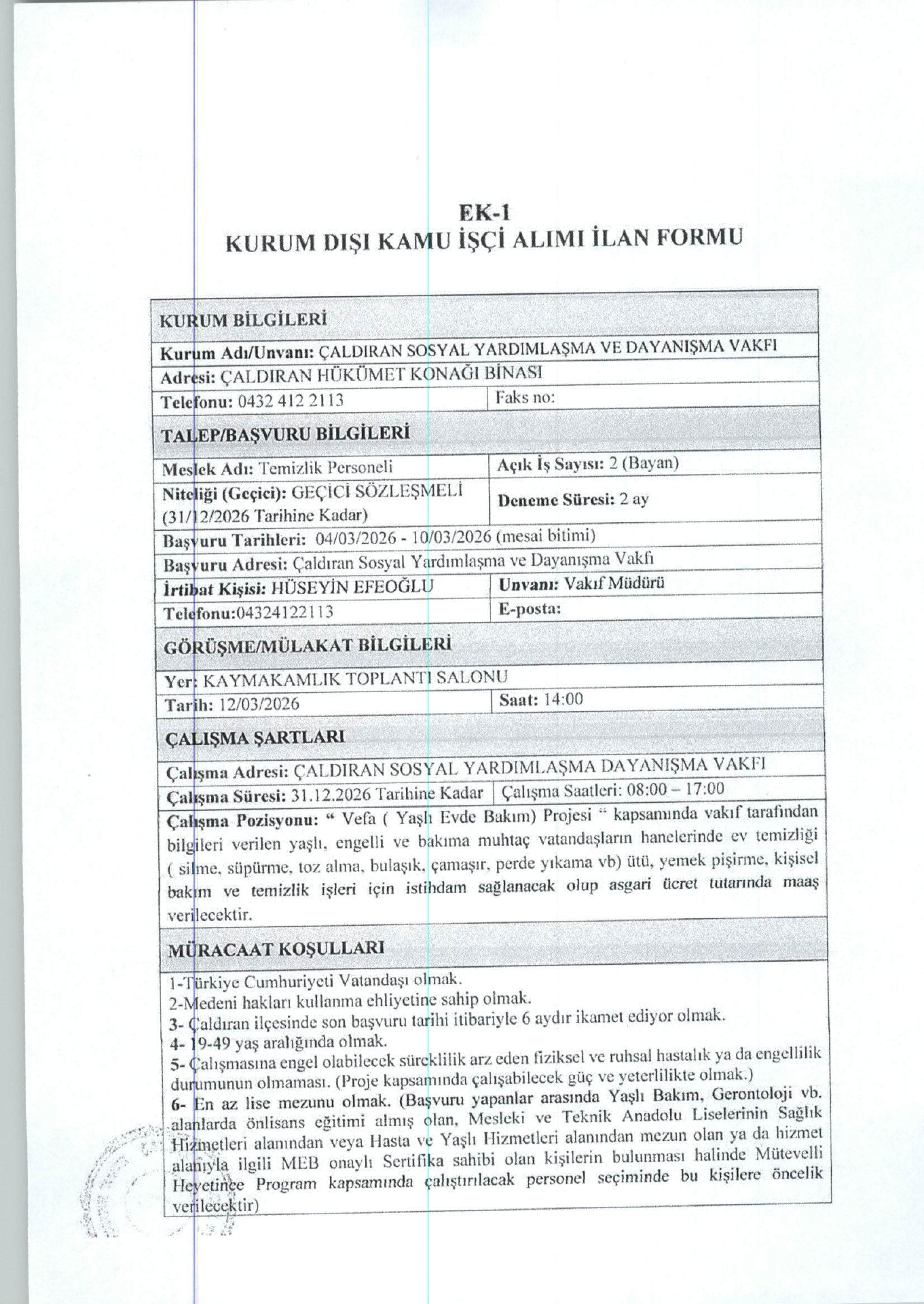 Ana sayfaSYDV İlanlarıAna sayfaGeçici İşçi İlanları Van Çaldıran SYDV Geçici 2 İşçi Alacak Van Çaldıran SYDV Geçici 2 İşçi Alacak. Son başvuru tarihi 10 Mart 2026 Kaynak : İşkur İlan Giriş : 04 Mart 2026 22:40, Son Güncelleme : 04 Mart 2026 22:58 Yazdır Yorumlar (0) Abone Ol