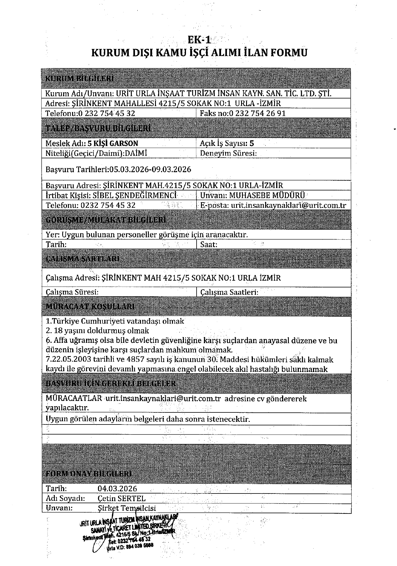 Ana sayfaGeçici İşçi İlanları İzmir Urit Urla İnşaat Geçici 5 İşçi Alacak İzmir Urit Urla İnşaat Geçici 5 İşçi Alacak. Son başvuru tarihi 9 Mart 2026 Kaynak : İşkur İlan Giriş : 04 Mart 2026 22:52, Son Güncelleme : 04 Mart 2026 22:54 Yazdır Yorumlar (0) Abone Ol
