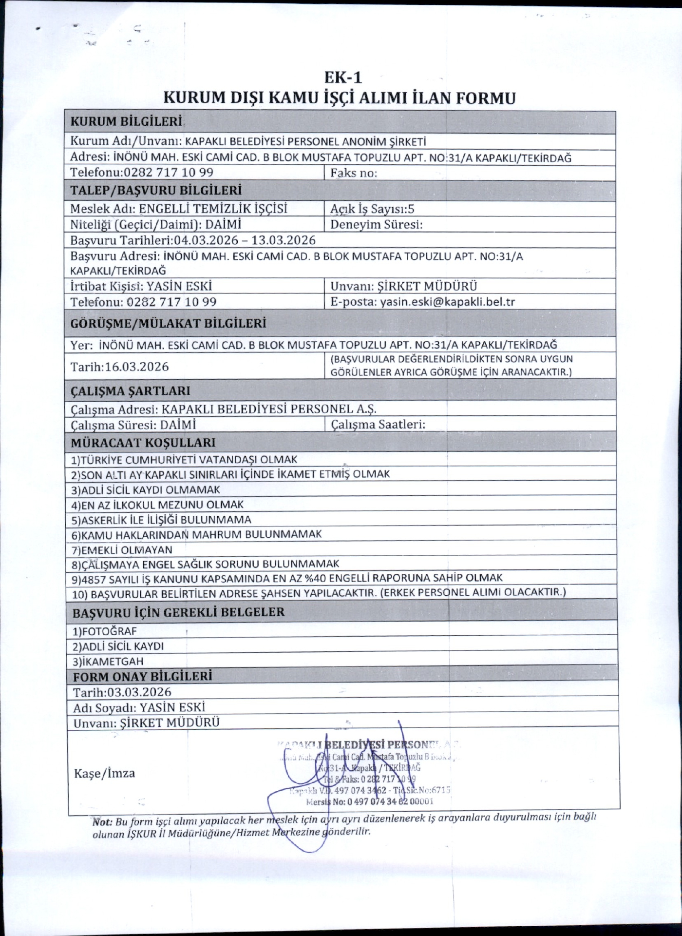 Ana sayfaDaimi İşçi İlanları Tekirdağ Kapaklı Belediyesi 5 İşçi Alacak Tekirdağ Kapaklı Belediyesi 5 İşçi Alacak. Son başvuru tarihi 13 Mart 2026 Kaynak : İşkur İlan Giriş : 04 Mart 2026 22:58, Son Güncelleme : 04 Mart 2026 22:53 Yazdır Yorumlar (0) Abone Ol