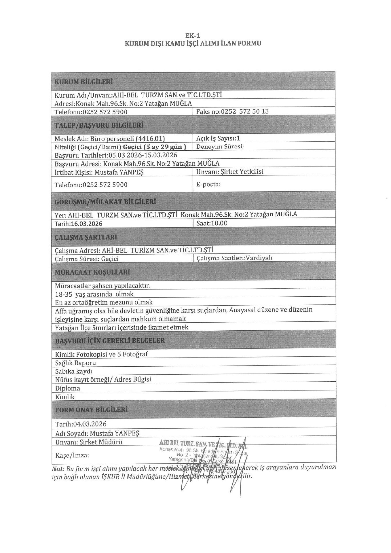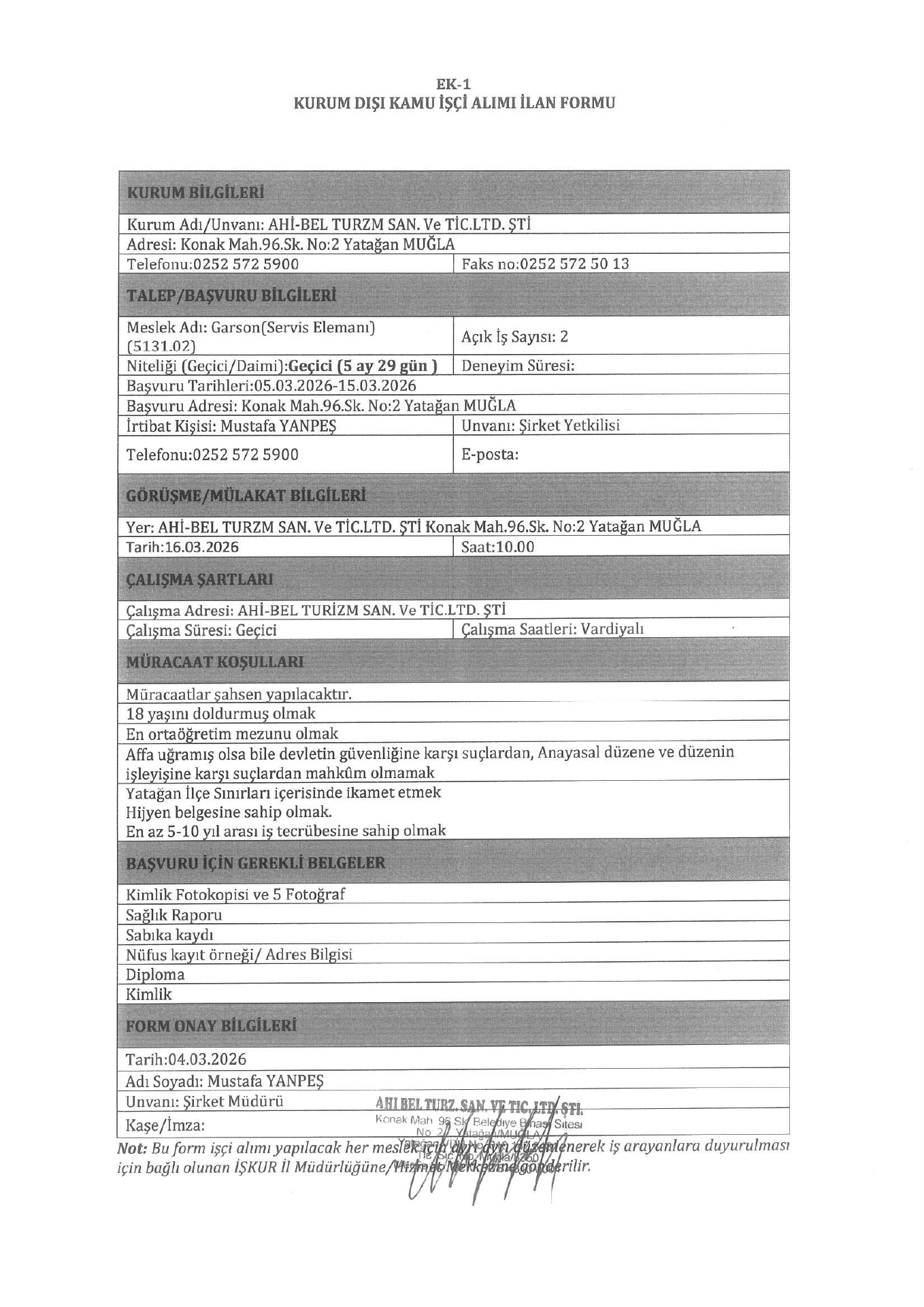 Muğla Ahi-Bel Geçici 13 İşçi Alacak. Son başvuru tarihi 15 Mart 2026