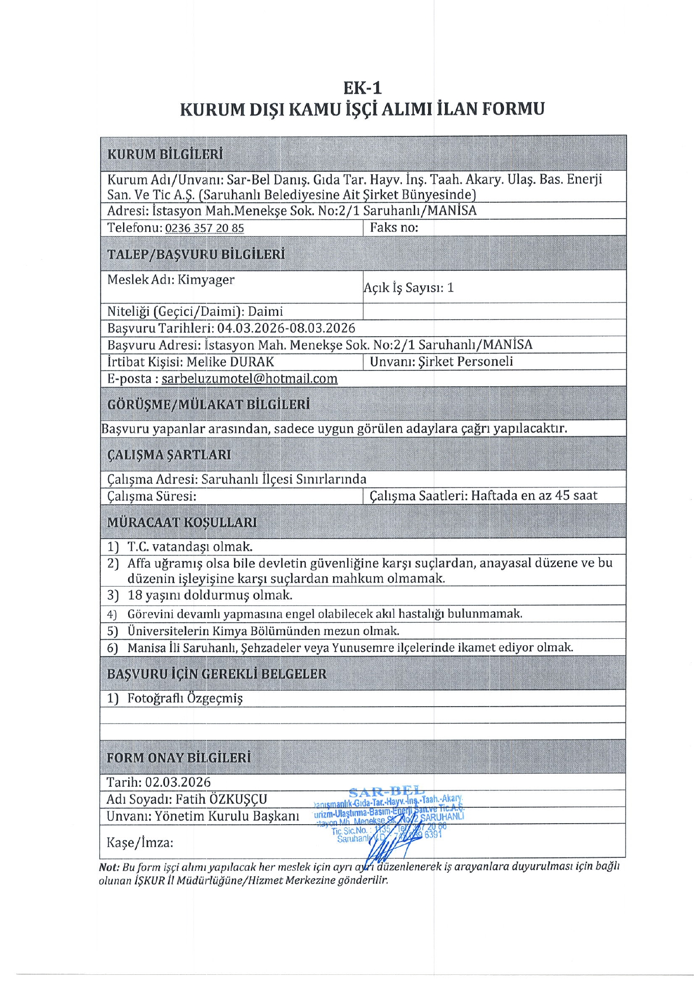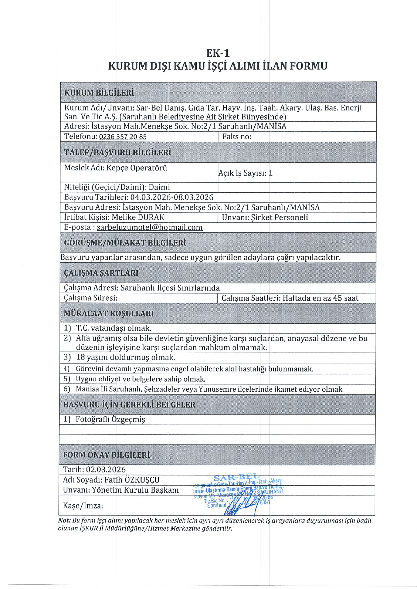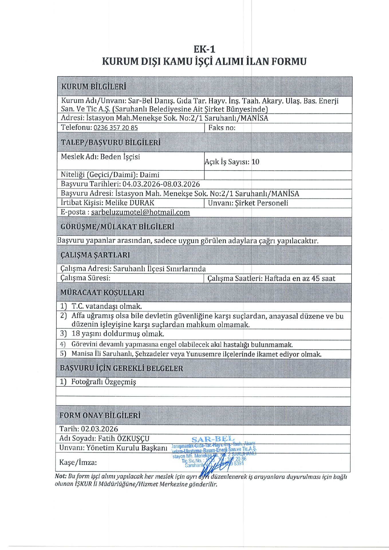 Ana sayfaDaimi İşçi İlanları Manisa Sarbel 13 İşçi Alacak Manisa Sarbel 13 İşçi Alacak. Son başvuru tarihi 8 Mart 2026 Kaynak : İşkur İlan Giriş : 04 Mart 2026 23:05, Son Güncelleme : 04 Mart 2026 22:51 Yazdır Yorumlar (0) Abone Ol