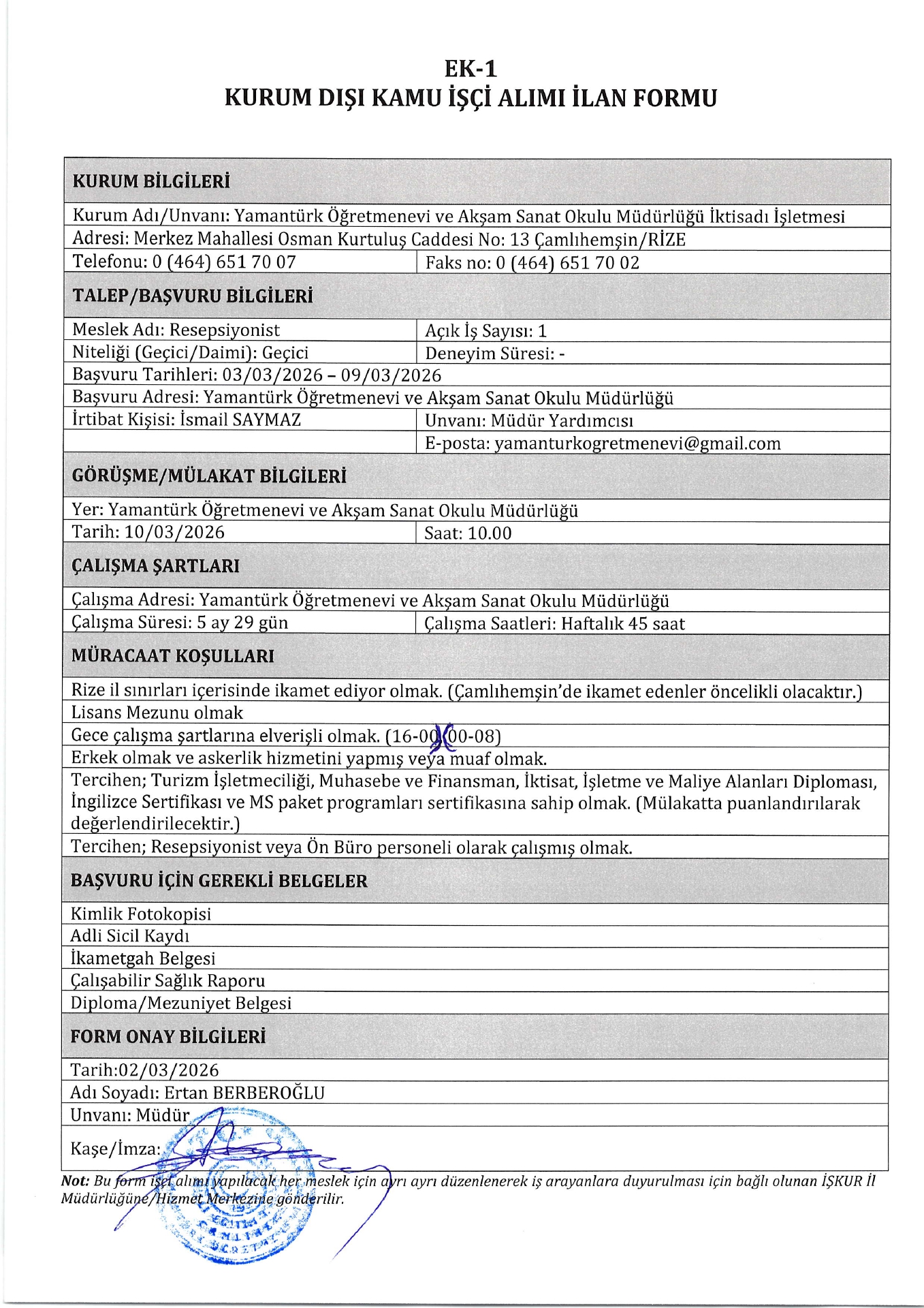 Ana sayfaGeçici İşçi İlanları Rize Yamantürk Öğretmenevi Geçici 1 İşçi Alacak Rize Yamantürk Öğretmenevi Geçici 1 İşçi Alacak. Son başvuru tarihi 9 Mart 2026 Kaynak : İşkur İlan Giriş : 04 Mart 2026 23:13, Son Güncelleme : 04 Mart 2026 22:49 Yazdır Yorumlar (0) Abone Ol