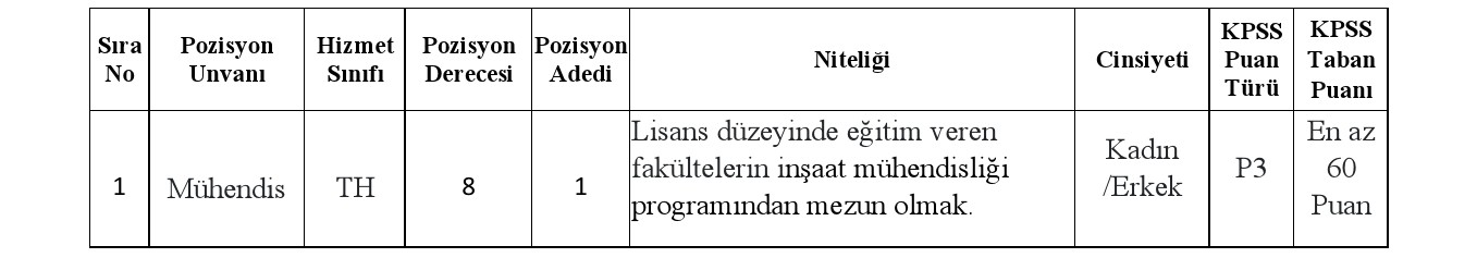 Tekirdağ ili Çerkezköy Belediye Başkanlığı bünyesinde 5393 sayılı Belediye Kanununun 49 uncu maddesi ile Mahalli İdarelere İlk Defa Atanacaklara Dair Sınav ve Atama Yönetmeliği hükümlerine göre aşağıda unvanı, sınıfı, derecesi, adedi, nitelikleri, KPSS puan türü, KPSS taban puanı ve diğer şartları taşımak kaydıyla, belirtilen boş pozisyona tam zamanlı sözleşmeli personel alınacaktır.