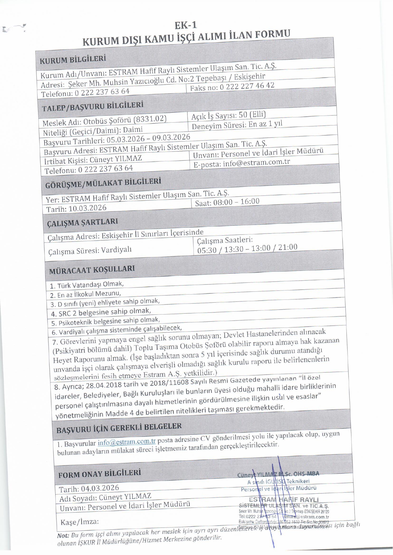 Ana sayfaDaimi İşçi İlanları Eskişehir Estram 50 İşçi Alacak Eskişehir Estram 50 İşçi Alacak. Son başvuru tarihi 9 Mart 2026 Kaynak : İşkur İlan Giriş : 05 Mart 2026 23:16, Son Güncelleme : 05 Mart 2026 23:16 Yazdır Yorumlar (0) Abone Ol