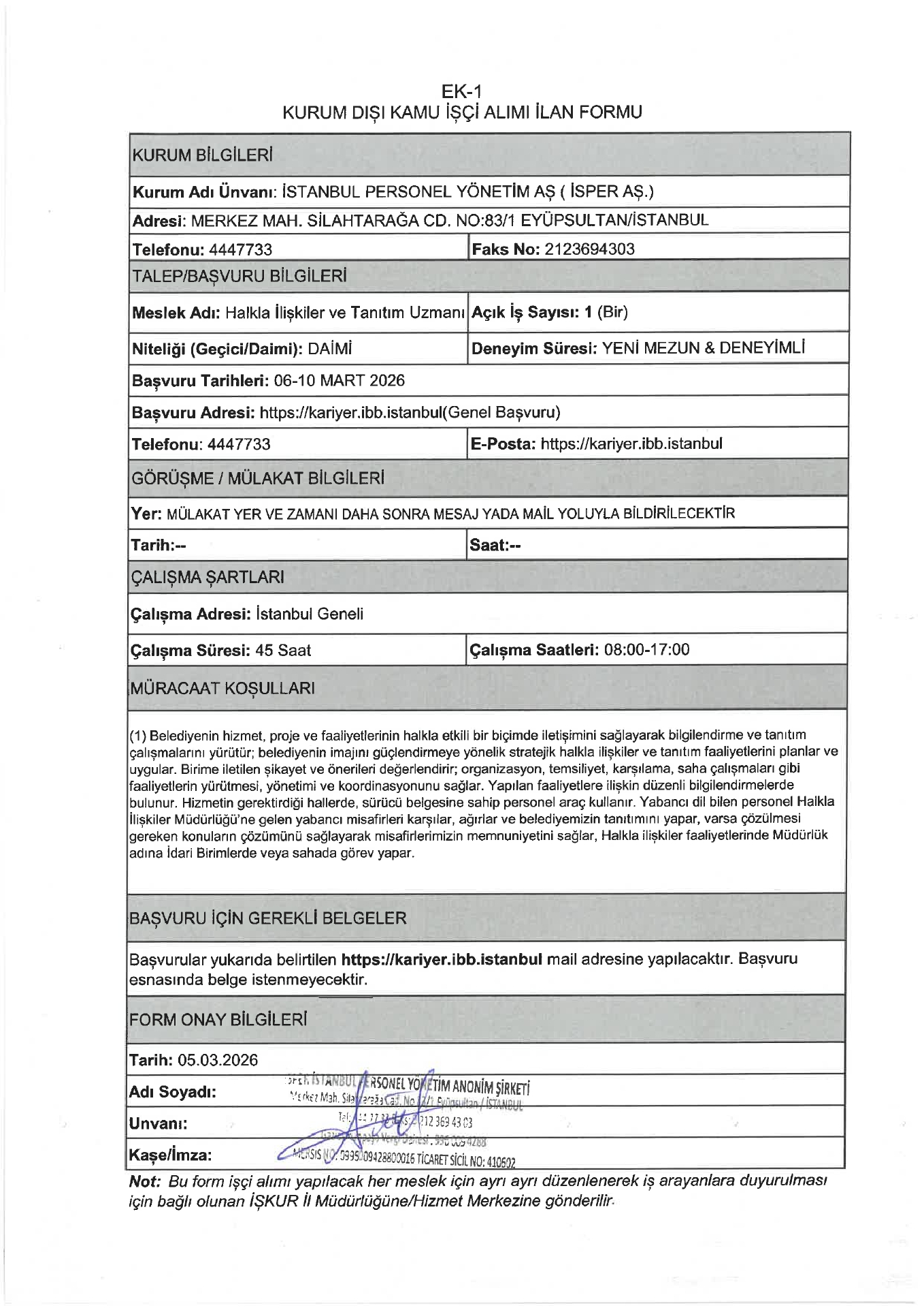 Ana sayfaDaimi İşçi İlanları İstanbul Personel Yönetim Aş. 1 İşçi Alacak İstanbul Personel Yönetim Aş. 1 İşçi Alacak. Son başvuru tarihi 10 Mart 2026 Kaynak : İşkur İlan Giriş : 05 Mart 2026 23:22, Son Güncelleme : 05 Mart 2026 23:15 Yazdır Yorumlar (0) Abone Ol
