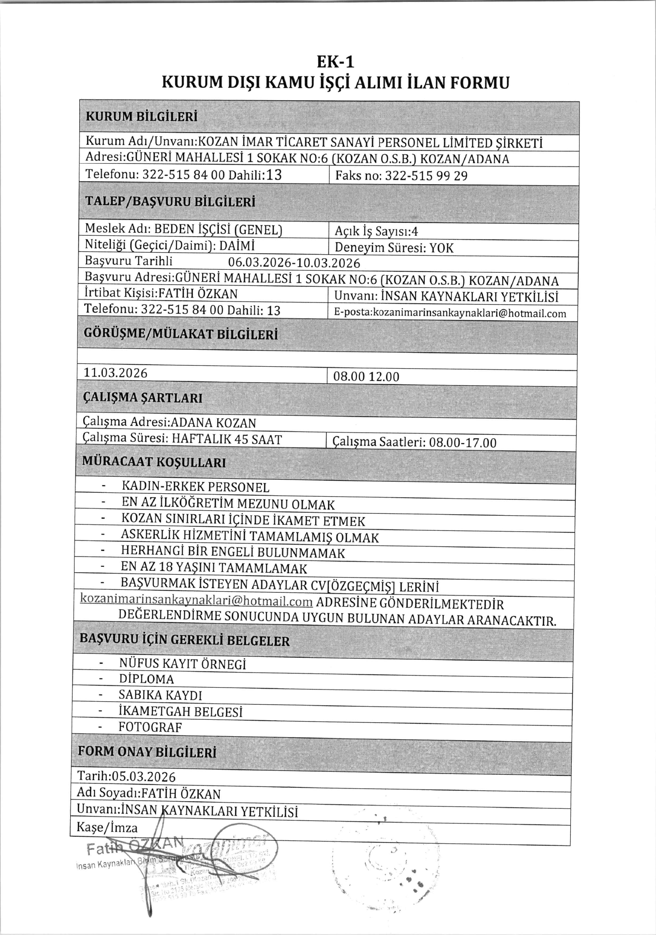 Ana sayfaDaimi İşçi İlanları Adana Kozan İmar 4 İşçi Alacak Adana Kozan İmar 4 İşçi Alacak. Son başvuru tarihi 10 Mart 2026 Kaynak : İşkur İlan Giriş : 05 Mart 2026 23:59, Son Güncelleme : 05 Mart 2026 23:14 Yazdır Yorumlar (0) Abone Ol