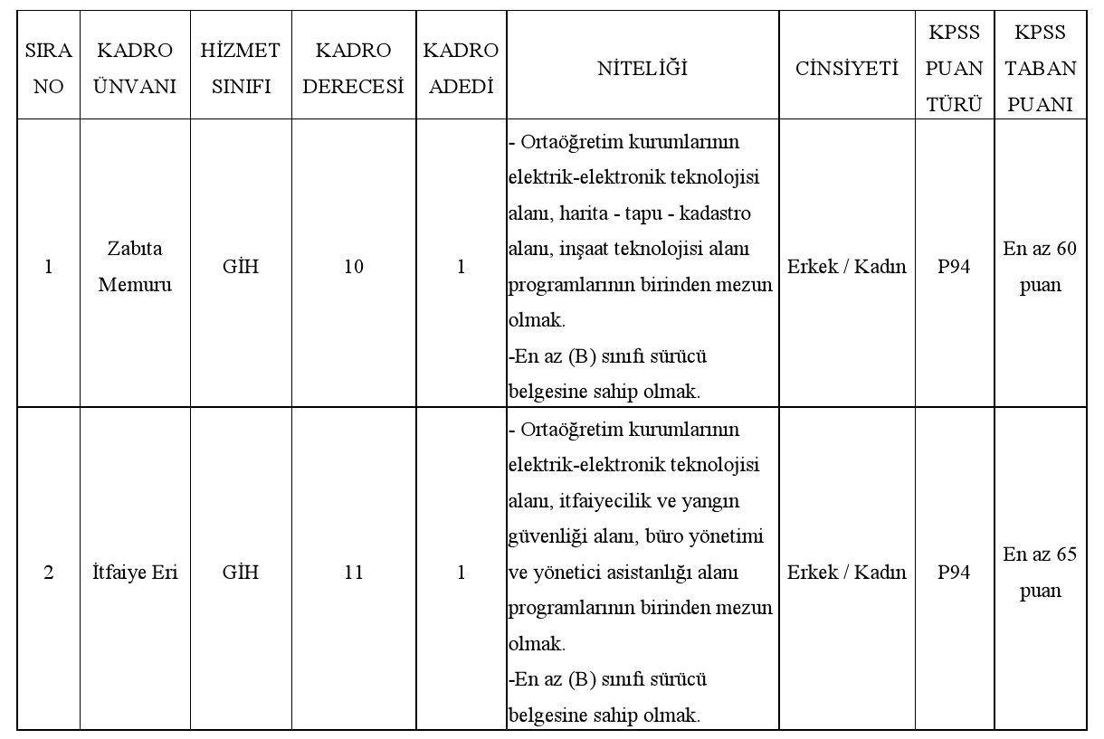 Isparta ili Sarıidris Belediye Başkanlığı bünyesinde, 657 sayılı Devlet Memurları Kanununa tabi olarak istihdam edilmek üzere; Belediye Zabıta Yönetmeliği ile Belediye İtfaiye Yönetmeliği hükümlerine göre aşağıda ünvanı, sınıfı, derecesi, adedi, nitelikleri, KPSS puan türü, KPSS taban puanı ve diğer şartları taşımak kaydıyla, belirtilen boş kadrolara açıktan atama yoluyla zabıta memuru ve itfaiye eri alınacaktır.
