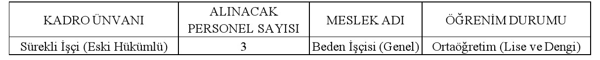 Üniversitemiz hizmet birimlerinde istihdam edilmek üzere; 4857 sayılı İş Kanunu, 2 sayılı Genel Kadro ve Usulü Hakkında Cumhurbaşkanlığı Kararnamesi ile "Kamu Kurum ve Kuruluşlarına Eski Hükümlü veya Terörle Mücadelede Malul Sayılmayacak Şekilde Yaralananların İşçi Olarak Alınmasında Uygulanacak Usul ve Esaslar Hakkında Yönetmelik" hükümleri çerçevesinde Türkiye İş Kurumu (İŞKUR) aracılığı ile 3 Eski Hükümlü sürekli işçi alımı yapılacaktır.