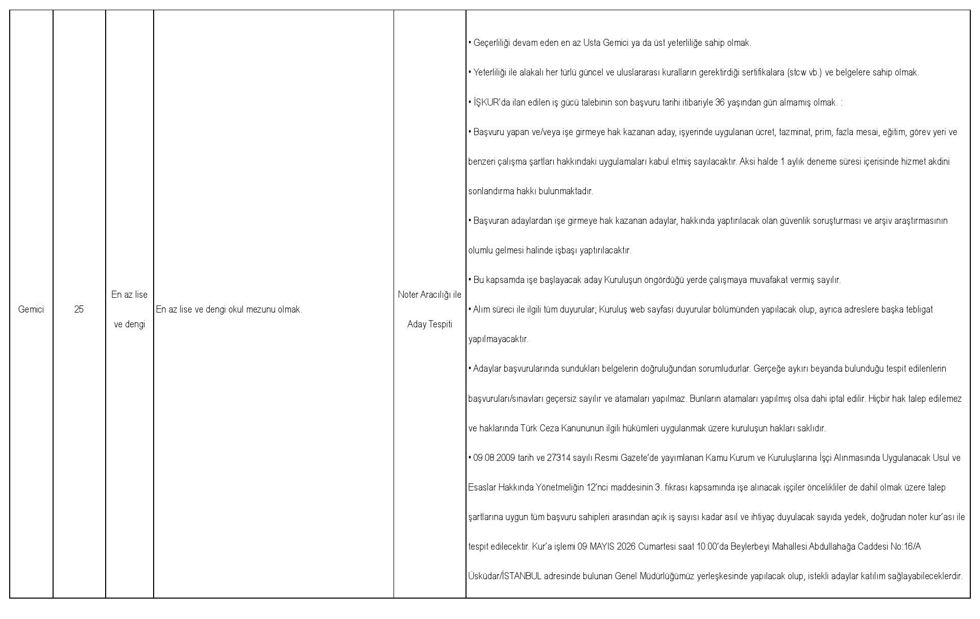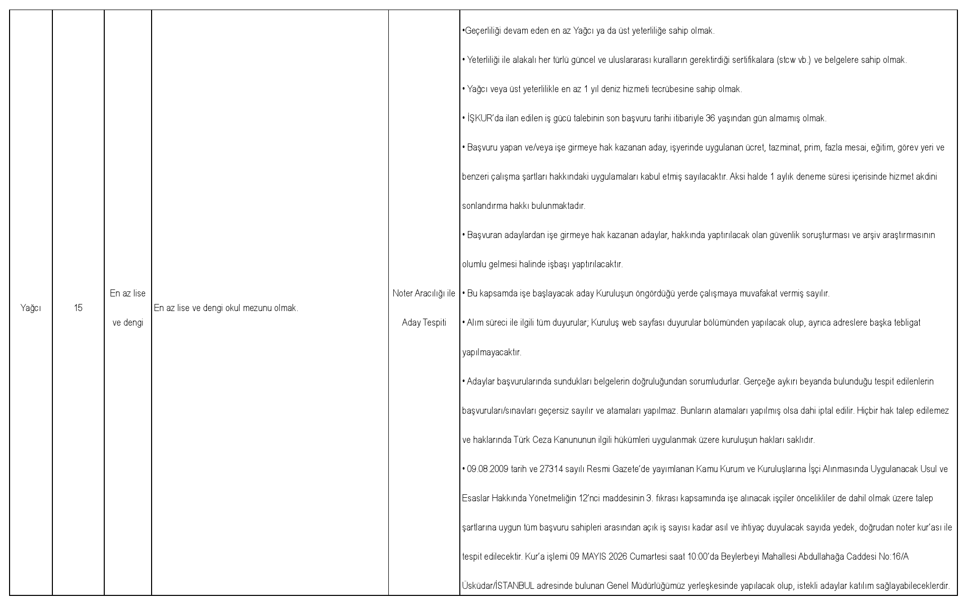 c-) Gemici ve Yağcı ünvanında işe alınacak olan adaylar öncelikliler de dahil olmak üzere talep şartlarına uygun tüm başvuru sahipleri arasından doğrudan noter kur'ası ile atama yapılacak kadro sayısı kadar asıl ve asıl aday sayısı kadar da yedek aday tespit edilecektir.