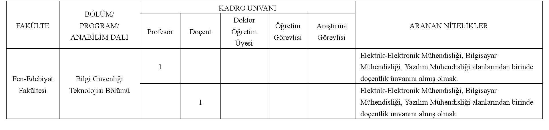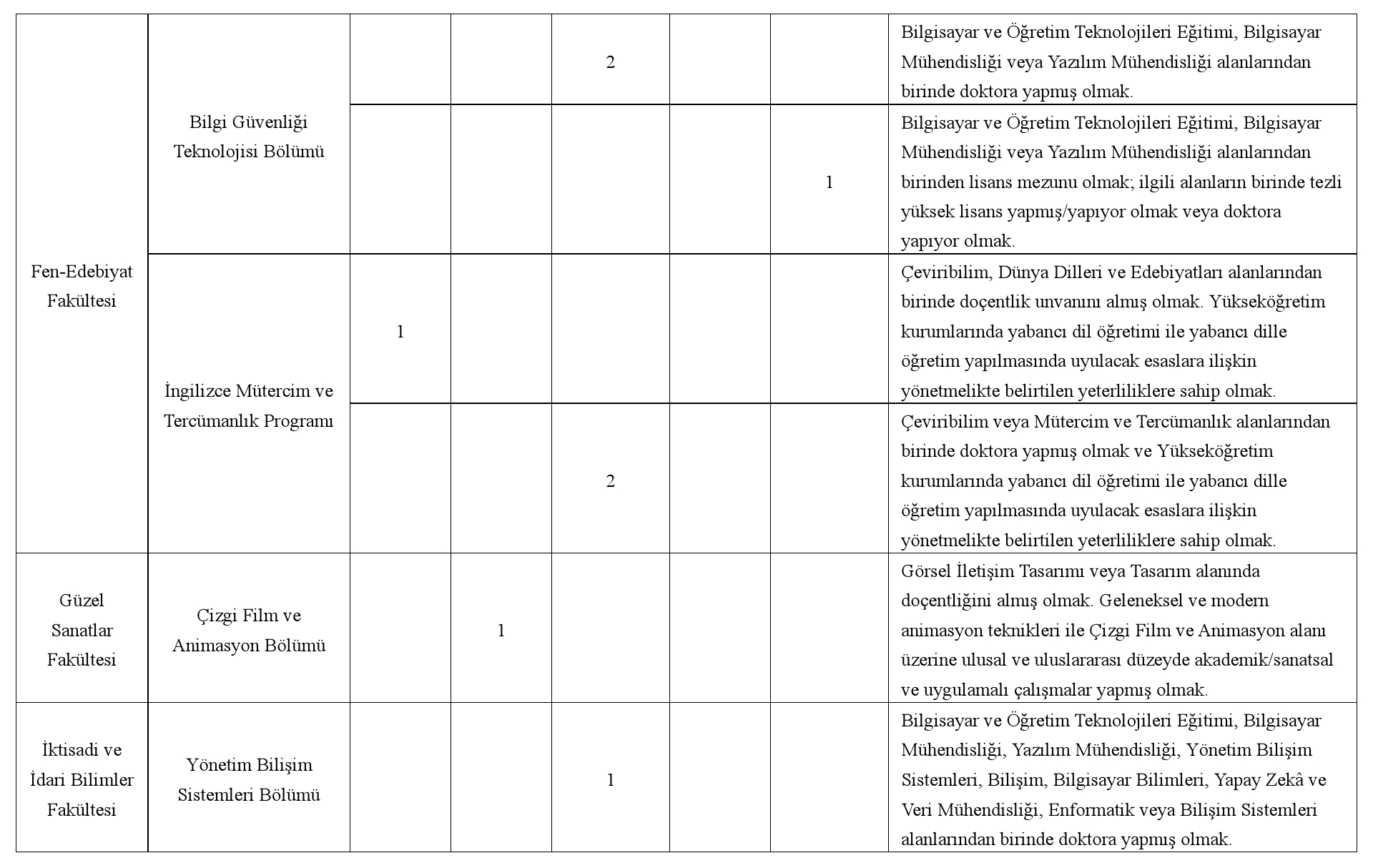 Üniversitemizin aşağıda belirtilen Fakülte/Yüksekokul bölümlerine 2547 sayılı Kanun'un ilgili maddelerine göre öğretim elemanları alınacaktır. 2547 sayılı Kanunun ilgili maddeleri, "Öğretim Üyeliğine Yükseltilme ve Atanma Yönetmeliği" ve 09/11/2018 tarihli ve 30590 sayılı Resmi Gazete'de yayımlanan "Öğretim Üyesi Dışındaki Öğretim Elemanı Kadrolarına Yapılacak Atamalarda Uygulanacak Merkezi Sınav ile Giriş Sınavlarına İlişkin Usul ve Esaslar Hakkında Yönetmelik" hükümleri uyarınca ve ilandaki "Aranan Nitelikler" başlığı altında yer alan koşulları sağlayan öğretim elemanlarından;