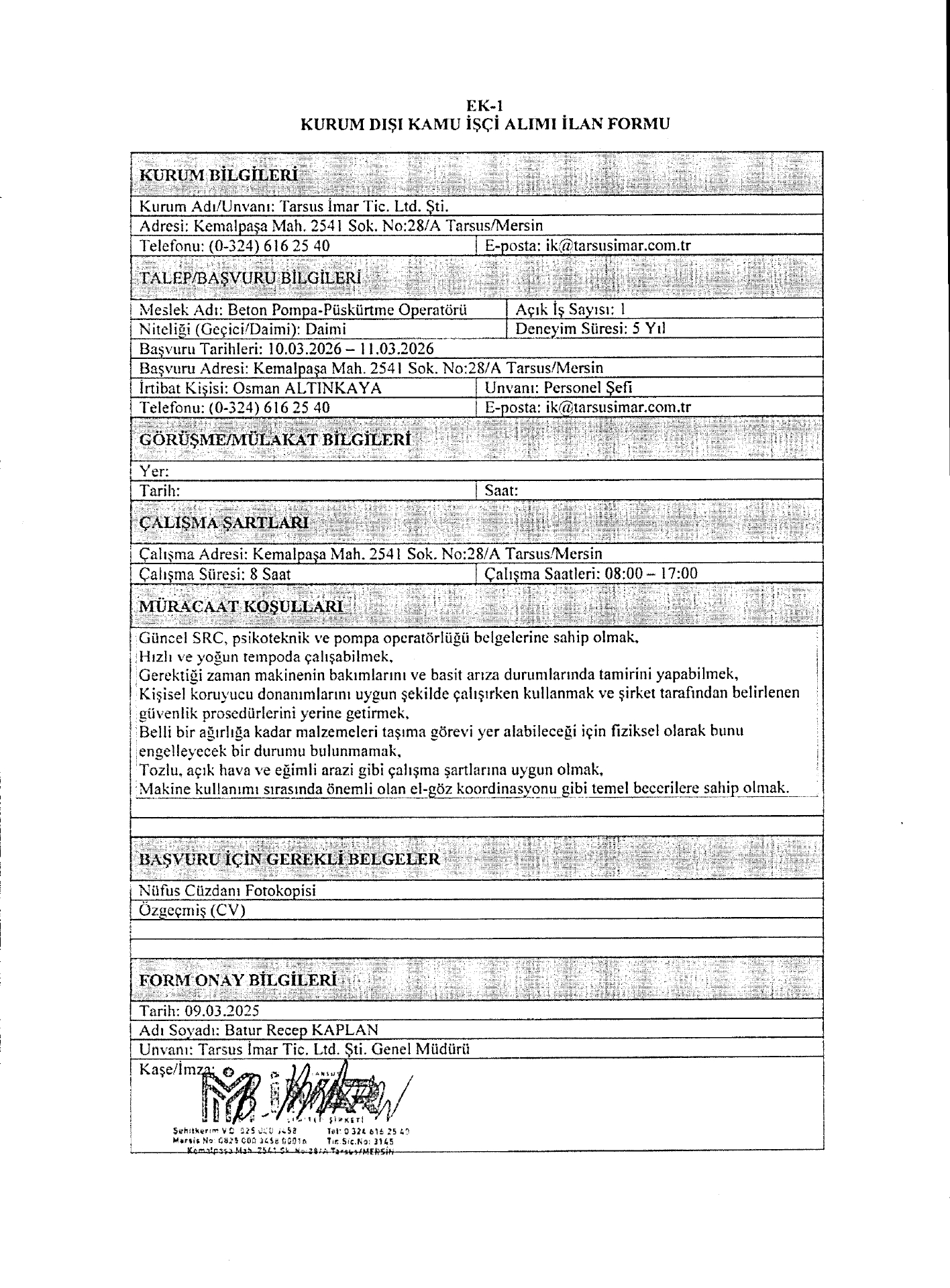 Ana sayfaDaimi İşçi İlanları Mersin Tarsus İmar 1 İşçi Alacak Mersin Tarsus İmar 1 İşçi Alacak. Son başvuru tarihi 11 Mart 2026 Kaynak : İşkur İlan Giriş : 09 Mart 2026 23:36, Son Güncelleme : 09 Mart 2026 23:46 Yazdır Yorumlar (0) Abone Ol