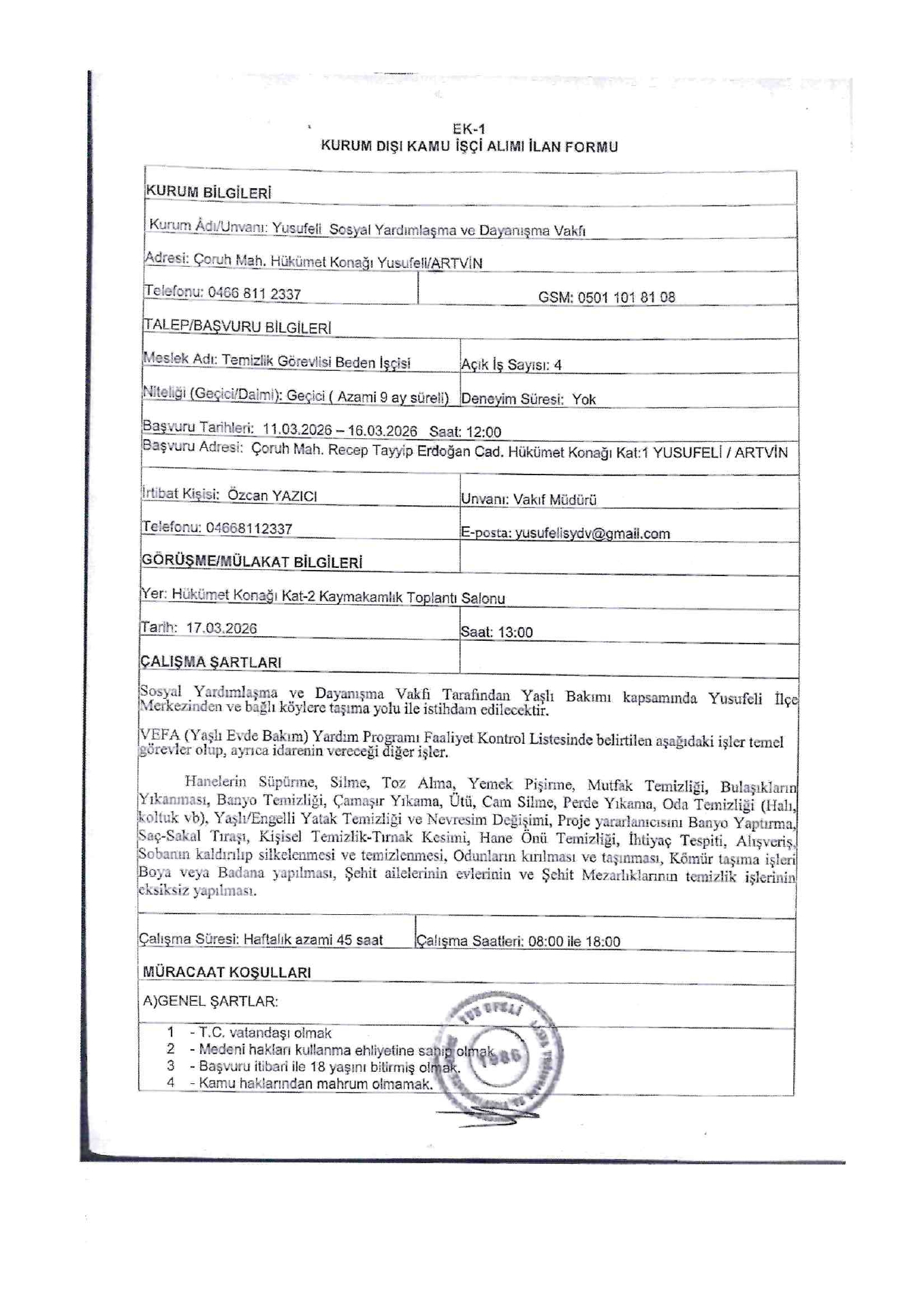 Ana sayfaGeçici İşçi İlanları Artvin Yusufeli SYDV Geçici 4 İşçi Alacak Artvin Yusufeli SYDV Geçici 4 İşçi Alacak. Son başvuru tarihi 16 Mart 2026 Kaynak : İşkur İlan Giriş : 11 Mart 2026 23:35, Son Güncelleme : 12 Mart 2026 02:18 Yazdır Yorumlar (0) Abone Ol