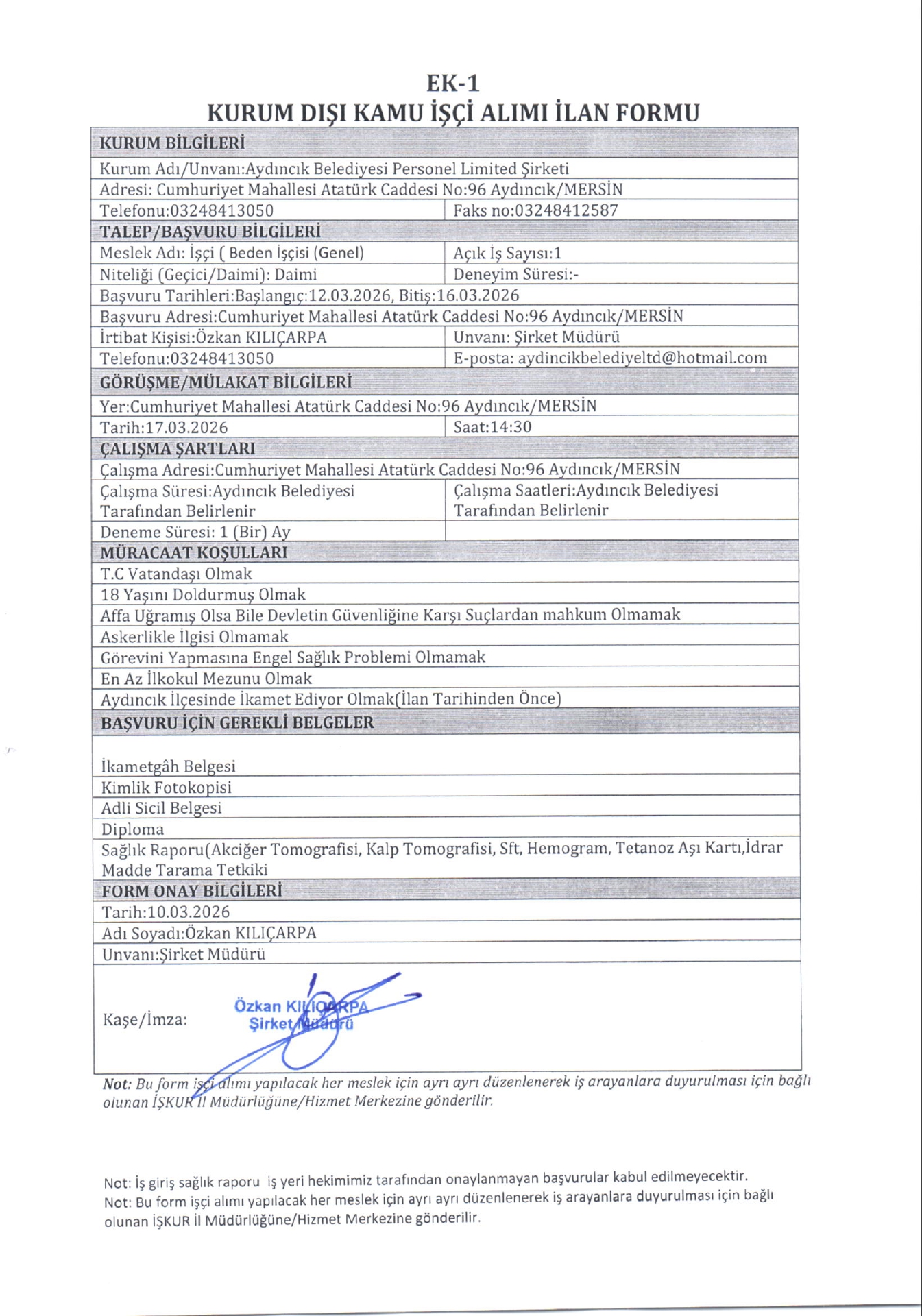 Ana sayfaDaimi İşçi İlanları Mersin Aydıncık Belediyesi 1 İşçi Alacak Mersin Aydıncık Belediyesi 1 İşçi Alacak. Son başvuru tarihi 16 Mart 2026 Kaynak : İşkur İlan Giriş : 11 Mart 2026 23:37, Son Güncelleme : 12 Mart 2026 02:17 Yazdır Yorumlar (0) Abone Ol