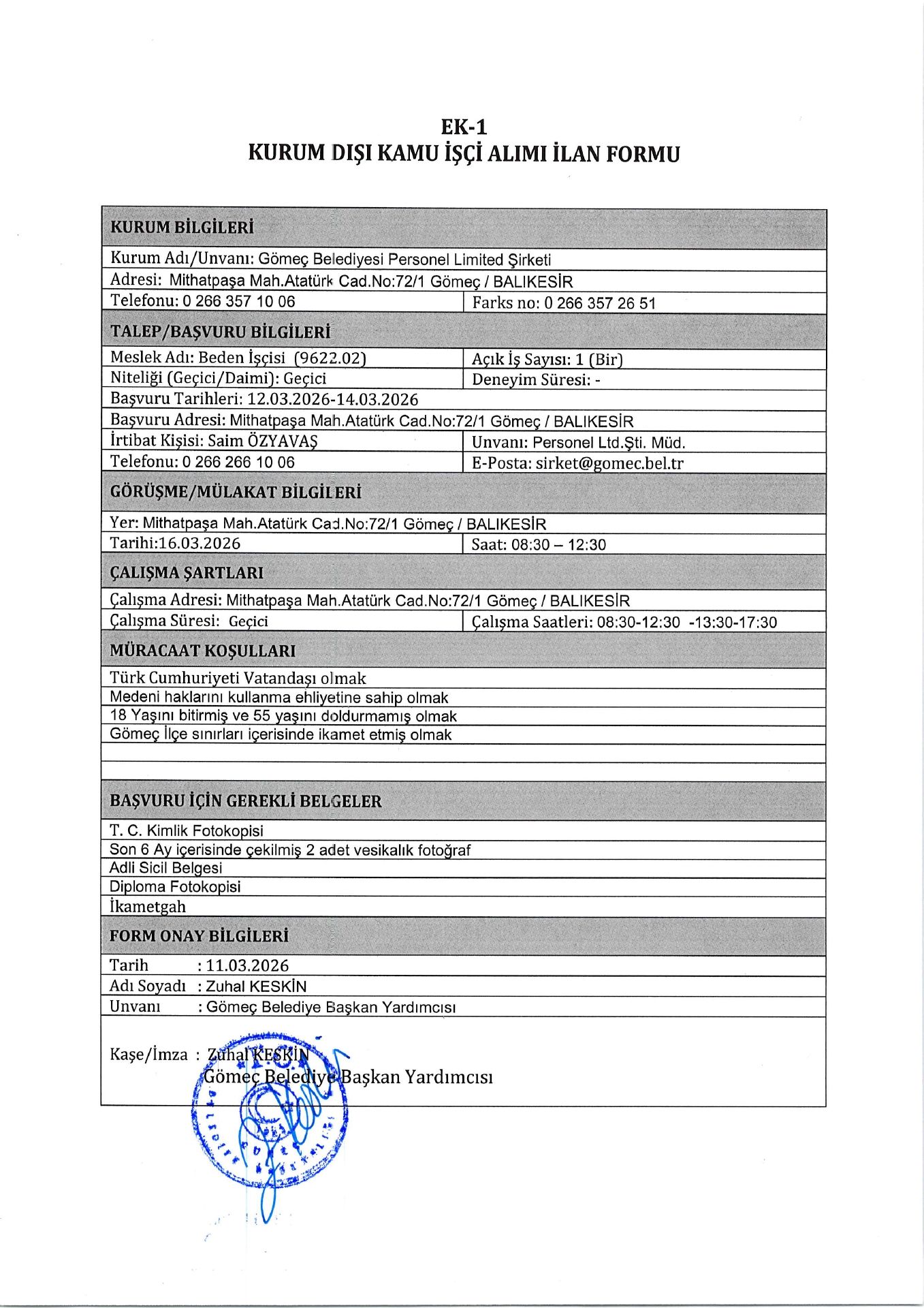 Ana sayfaGeçici İşçi İlanları Balıkesir Gömeç Belediyesi Geçici 1 İşçi Alacak Balıkesir Gömeç Belediyesi Geçici 1 İşçi Alacak. Son başvuru tarihi 14 Mart 2026 Kaynak : İşkur İlan Giriş : 11 Mart 2026 23:44, Son Güncelleme : 12 Mart 2026 02:15 Yazdır Yorumlar (0) Abone Ol