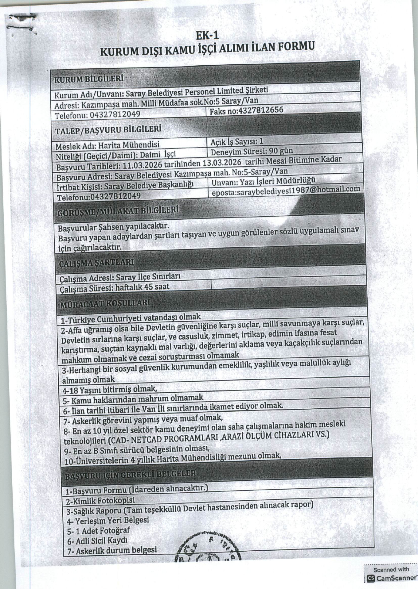 Van Saray Belediyesi 1 İşçi Alacak. Son başvuru tarihi 19 Mart 2026