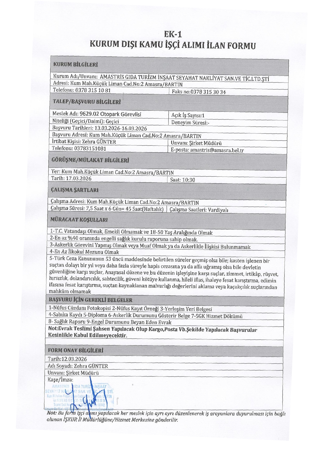 Ana sayfaGeçici İşçi İlanları Bartın Amastris Gıda Geçici 1 İşçi Alacak Bartın Amastris Gıda Geçici 1 İşçi Alacak. Son başvuru tarihi 16 Mart 2026 Kaynak : İşkur İlan Giriş : 12 Mart 2026 23:04, Son Güncelleme : 12 Mart 2026 23:42 Yazdır Yorumlar (0) Abone Ol