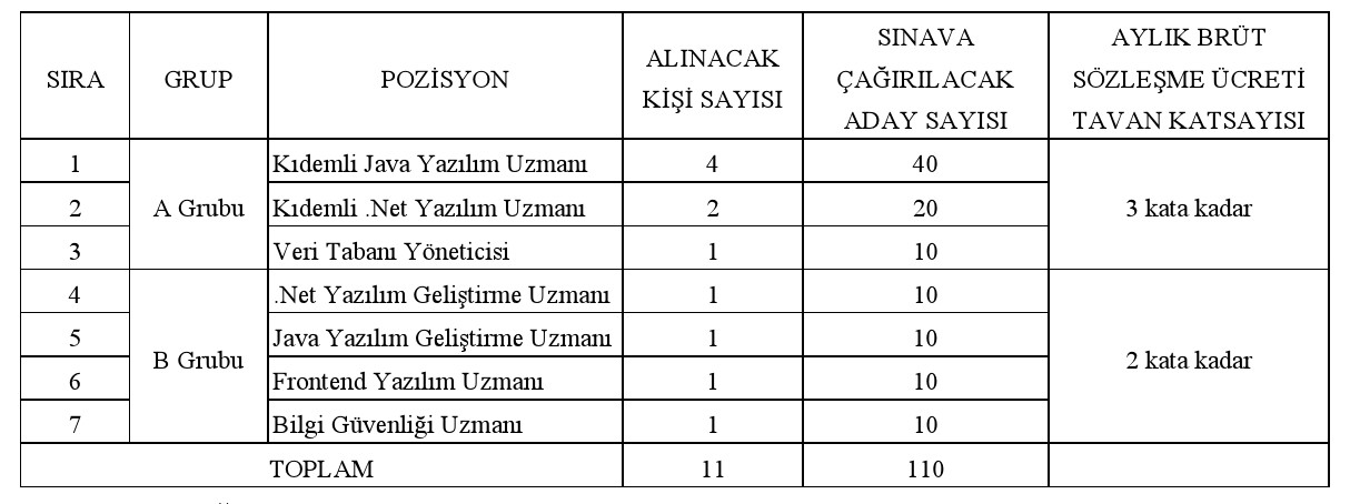 1- Kıdemli Java Yazılım Uzmanı (4 kişi, tam zamanlı, aylık brüt sözleşme ücret tavanının 3 katına kadar)