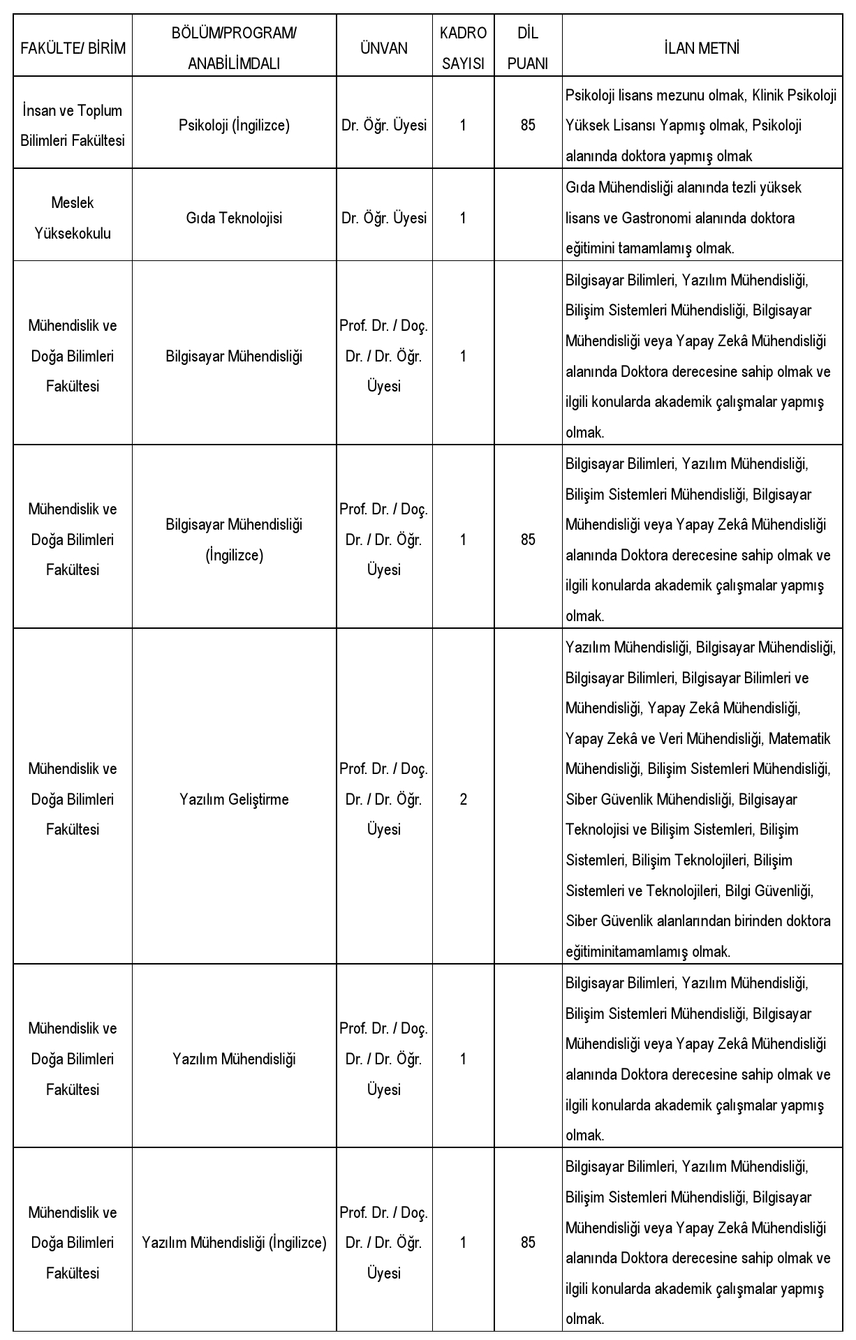 Doçent/Doktor Öğretim Üyesi (Dr. Öğr. Üyesi) adaylarının; [Birer adet ve çıktı olacak şekilde hazırlamaları gereken; Başvuru dilekçesini, YÖK Formatlı özgeçmişlerini, Lisans, Yüksek Lisans, Doktora Belgesi, Doçentlik Belgesi (Doçent adaylar için), Uzmanlık Belgesi veya Sanatta Yeterlilik Belgesi fotokopileri ile birlikte Nüfus Cüzdanı Önyüzü Fotokopisi varsa yabancı dil başarı belgesi ile Çalışma/Emeklilik Belgesini içeren başvuru dosyalarına],