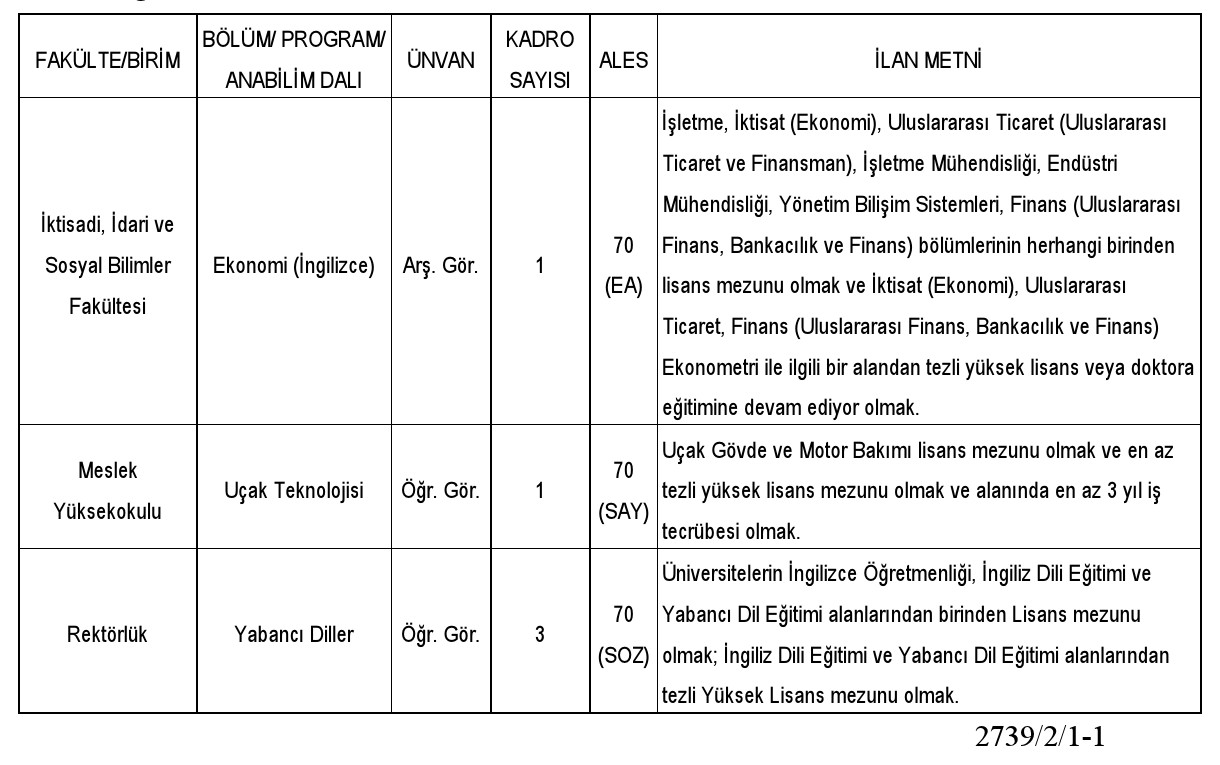 Üniversitemizin aşağıda belirtilen birimlerine, 2547 sayılı Yükseköğretim Kanunu'nun 33. Maddesi ve "Öğretim Üyesi Dışındaki Öğretim Elemanı Kadrolarına Yapılacak Atamalarda Uygulanacak Merkezi Sınav ile Giriş Sınavlarına İlişkin Usul ve Esaslar Hakkında Yönetmeliği'nin ilgili maddelerine göre Araştırma Görevlisi-Öğretim Görevlisi alınacaktır.