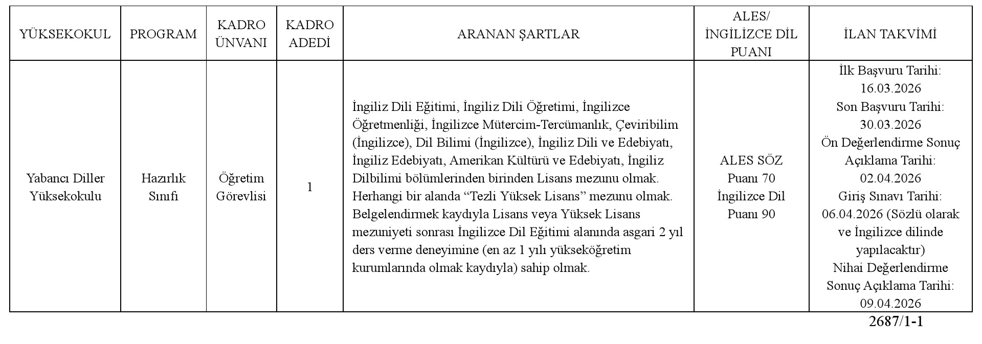 * İlgili Yönetmeliğin 6. maddesinin (2) numaralı bendi kapsamında ve T.C. Yaşar Üniversitesi Senatosu'nun 22.10.2025 tarih ve 533 sayılı toplantı kararı gereği, öğretim üyesi dışındaki öğretim elemanı kadrolarına yapılacak atamalarda adaylarda; Yabancı Diller Yüksekokulu için yabancı dil (İngilizce) 100 üzerinden en az 90 puana sahip olma şartı aranır.