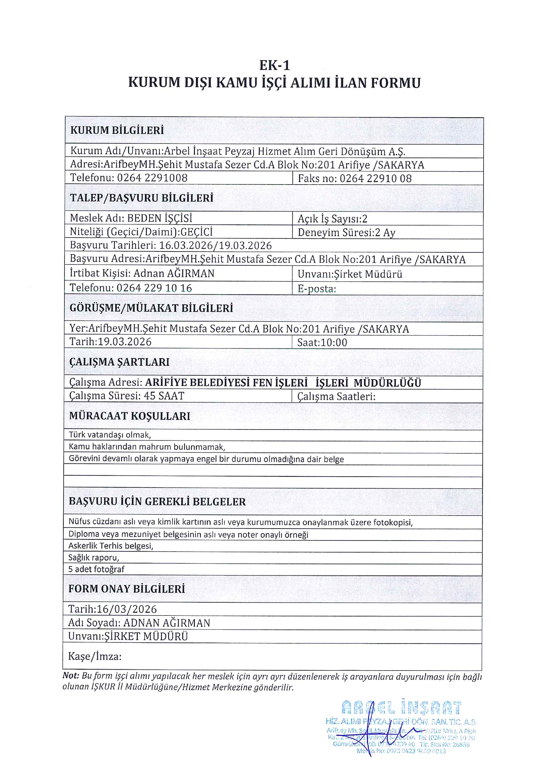 Sakarya Arbel Geçici 2 İşçi Alacak. Son başvuru tarihi 19 Mart 2026