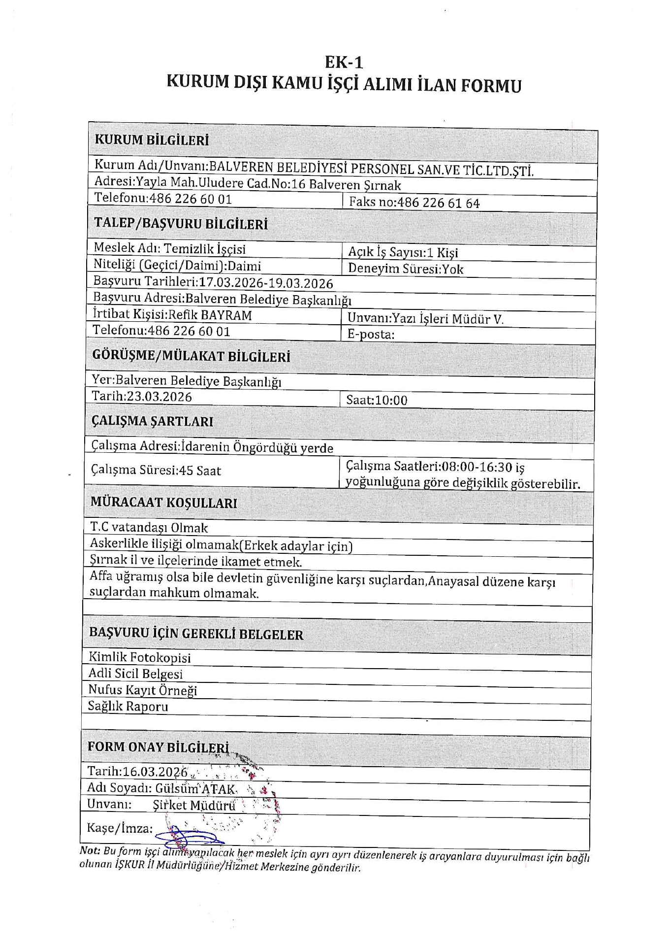 Şırnak Balveren Belediyesi 1 İşçi Alacak. Son başvuru tarihi 19 Mart 2026