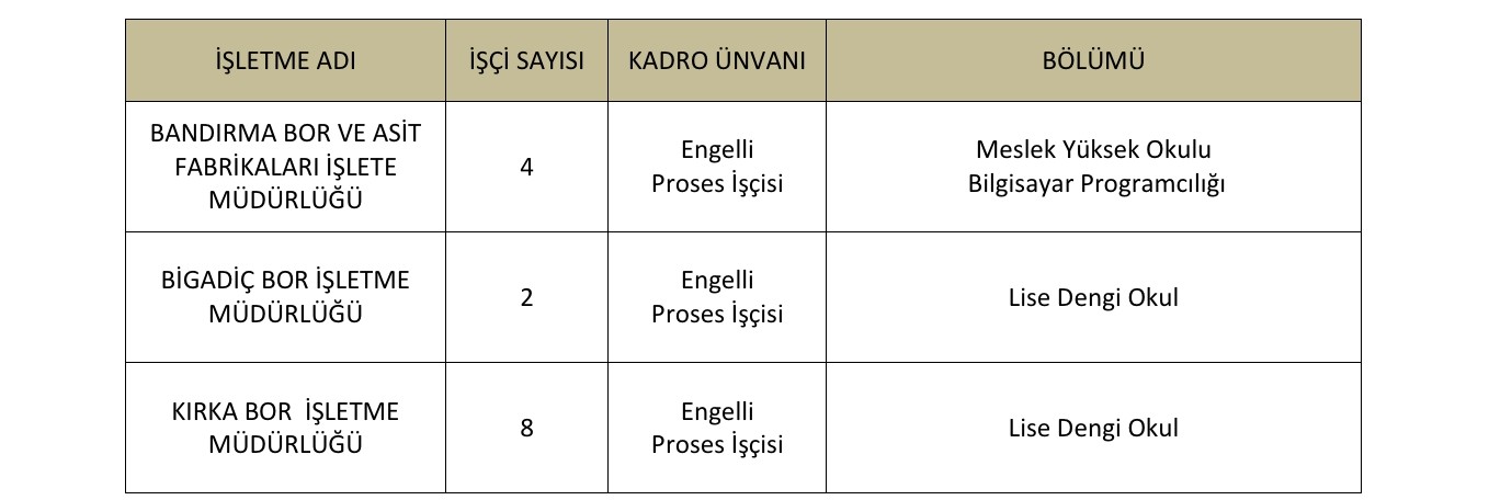 Teşekkülümüz Bandırma Bor ve Asit Fabrikaları İşletme Müdürlüğüne (Bandırma/BALIKESİR) Engelli 4, Bigadiç Bor İşletme Müdürlüğüne (Bigadiç/BALIKESİR) Engelli 2, Kırka Bor İşletme Müdürlüğüne (Seyitgazi/ESKİŞEHİR) Engelli 8 olmak üzere toplam 14 engelli sürekli işçi için ilgili mercilerden gerekli izinler alınmıştır.
