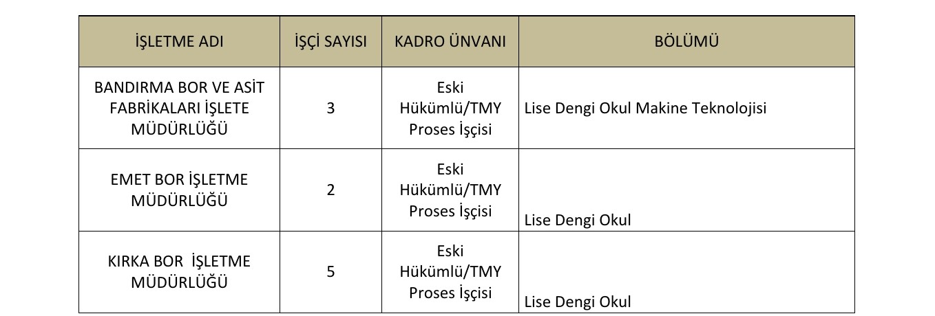 Teşekkülümüz Bandırma Bor ve Asit Fabrikaları İşletme Müdürlüğüne (Bandırma/BALIKESİR) Eski Hükümlü/TMY 3, Kırka Bor İşletme Müdürlüğüne (Seyitgazi/ESKİŞEHİR) Eski Hükümlü/TMY 5 ve Emet Bor İşletme Müdürlüğüne (Emet/KÜTAHYA) Eski Hükümlü 2 olmak üzere toplam 10 Eski Hükümlü/TMY sürekli işçi için ilgili mercilerden gerekli izinler alınmıştır.