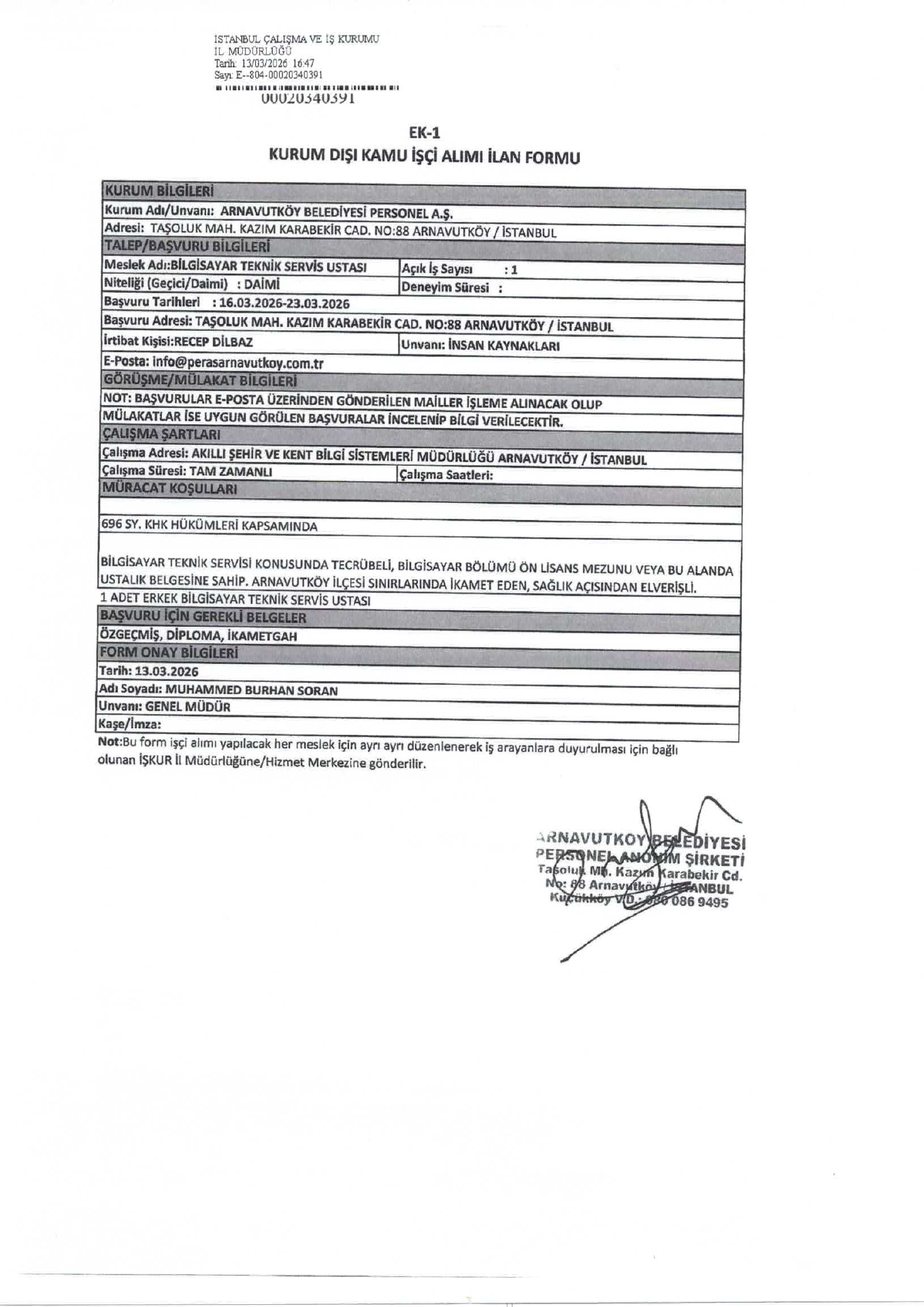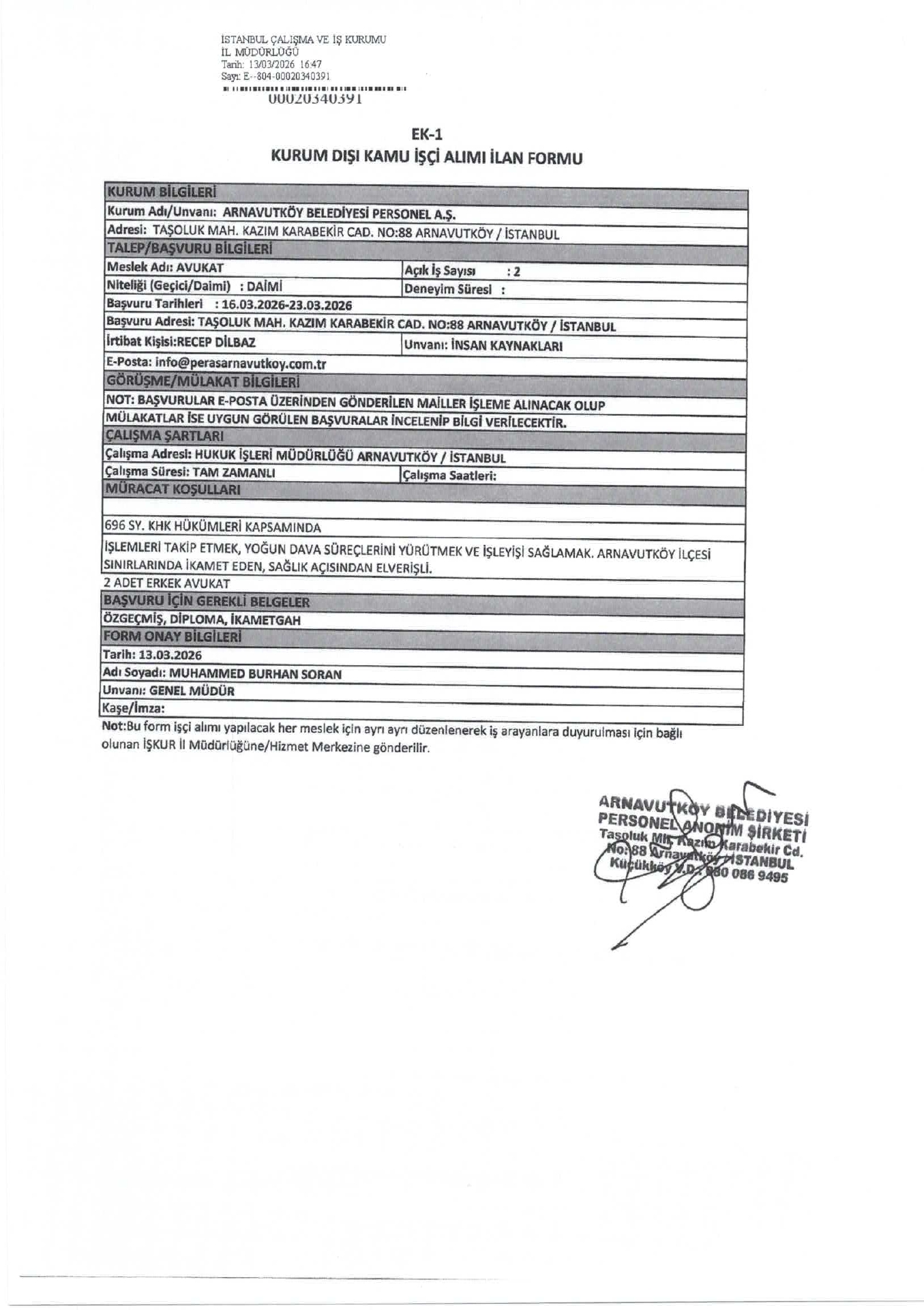 Ana sayfaDaimi İşçi İlanları İstanbul Arnavutköy Belediyesi 3 İşçi Alacak İstanbul Arnavutköy Belediyesi 3 İşçi Alacak. Son başvuru tarihi 23 Mart 2026 Kaynak : İşkur İlan Giriş : 17 Mart 2026 22:48, Son Güncelleme : 17 Mart 2026 23:47 Yazdır Yorumlar (0) Abone Ol