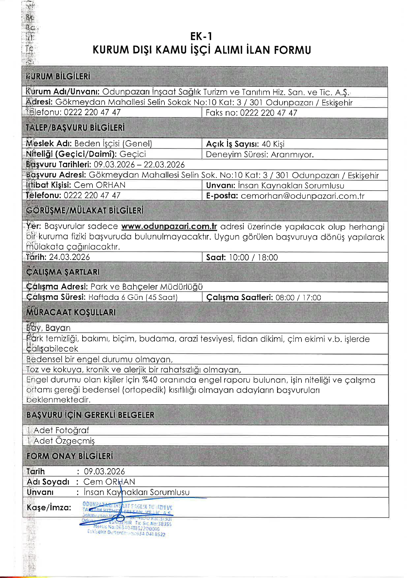 Ana sayfaGeçici İşçi İlanları Eskişehir Odunpazarı İnşaat Geçici 40 İşçi Alacak Eskişehir Odunpazarı İnşaat Geçici 40 İşçi Alacak. Son başvuru tarihi 22 Mart 2026 Kaynak : İşkur İlan Giriş : 17 Mart 2026 22:51, Son Güncelleme : 17 Mart 2026 23:46 Yazdır Yorumlar (0) Abone Ol
