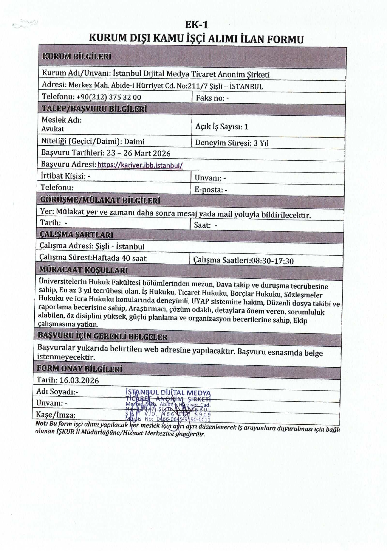 Ana sayfaDaimi İşçi İlanları İstanbul Dijital Medya 1 İşçi Alacak İstanbul Dijital Medya 1 İşçi Alacak. Son başvuru tarihi 26 Mart 2026 Kaynak : İşkur İlan Giriş : 17 Mart 2026 22:57, Son Güncelleme : 17 Mart 2026 23:45 Yazdır Yorumlar (0) Abone Ol